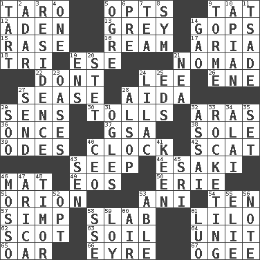 ACROSS 1. Edible starchy tuberous root 5. Elects 9. Make lace 12. An important port of Yemen 13. Jennifer or Joel 14. Republicans 15. Raze (variant) 16. 480, 500 or 516 sheets of paper 17. Roberta Peters solo 18. Three (prefix) 19. Compass dir. 21. Roamer 22. Do not 24. Area sheltered from the wind 26. Compass dir. 27. Gospel singer Marvin 28. Opera by Verdi 29. Elected reps. 30. For Whom the Bell _____ 32. Caspian sea tributary 36. Single time 37. Girls' org. (abbr.) 38. Not divided or shared with others 39. Lyric poems 40. Timepiece 42. Get outta here! 43. Ooze 44. 1973 Nobel Price Winner (Physics) Leo 46. Floor protector 49. Greek goddess of the dawn 50. One of the Great Lakes 51. Greek mythologigal hunter 53. Cuckoo 54. Nine, plus one 57. Simple or foolish person 58. Broad, flat, thick piece 61. _ and Stitch 62. Native of Scotland 63. Land 64. A single undivided whole 65. Rowing implement 66. Jane of fiction 67. Double curve, resembling the letter S DOWN 1. Small pie 2. The sixth month of the Jewish calendar 3. Dwelling 4. Single 5. Legendary monster 6. Before (prefix) 7. Afternoon social gathering 8. Symbol (abbr.) 9. Singer Mel 10. Bee-related 11. Sadhe (variant) 14. E Mali city 19. Followers of ems 20. Proofreading order 21. Teachers' org. 23. Fertile tracts in a desert 24. Pale purple color 25. Begley and Asner 27. Transmit 28. Columnist Joseph or Stewart 29. "Barney Miller" actor Jack 31. Stares 32. Slender Brazilian palm 33. Shooting up abruptly 34. Jai ____ 35. Put into a specified state 40. Corporate head (abbr.) 41. Peachy ____! 43. Elected rep. 45. _ Lanka 46. With motion or animation 47. N. Chile seaport 48. Southeast Indonesia island 52. Elect 53. Competent 55. Writer Wiesel 56. Observe 58. Compass dir. 59. Myrna of the movies 60. Wind 61. Nilotic language