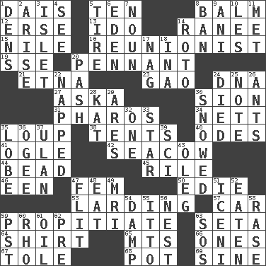 ACROSS 1. Raised platform 5. Nine, plus one 8. Lip ointment 12. Celtic language 13. Wedding promise 14. Indian princess (variant) 15. The longest river in the world 16. One who advocates reunion 19. Compass dir. 20. Pre-World Series prize 21. Inactive volcano in Sicily 23. E Mali city 24. Heredity factor (abbr.) 27. "____ silly question..." 30. The Jewish people; Israel 31. N Egypt peninsula 34. Remaining after all deductions 35. Central Nebraska county 38. Portable shelters 40. Lyric poems 41. Stare 42. Manatee 44. Necklace unit 45. Cause heat under the collar 46. Car or cant ending 47. Opposite of masc. 50. Singer Brickell 53. Preparing or cooking with lard 57. Automobile 59. Appease 63. Stalk of a moss capsule 64. Upper-body garment 65. Mountains (abbr.) 66. Singles 67. Lacquered or enameled metalware 68. Cooking vessel 69. Trig term DOWN 1. Habitations of wild animals 2. Get up 3. Small island 4. Perceive with the eye 5. Hoop that covers a wheel 6. Paradise 7. Part of speech 8. Prohibit 9. Cuckoo 10. French article 11. Was introduced to 14. Printing process, for short 17. Tired old horse 18. _ tizzy (2 wds.) 20. Romantic infatuation 22. Slept 24. Passed on 25. Observe 26. Pismires 28. Krazy ___ of comics 29. Ancient Greek god of war 30. Frozen precipiation fell 32. Single 33. Play the lead 35. Ear part 36. Double curve, resembling the letter S 37. Uhlan (variant) 39. _-fi 43. Cassini of fashion 47. Sudden quick movement 48. Consume 49. Medical imaging device (abbr.) 51. Ancient Celtic tribe of eastern Britain 52. Ingested 54. Moist 55. "Tell ____ the Marines!" 56. A home for chicks 58. Raze (variant) 59. Pacific Standard Time (abbr.) 60. 17th letter of the Greek alphabet 61. Petroleum 62. Before (prefix) 63. Mayday