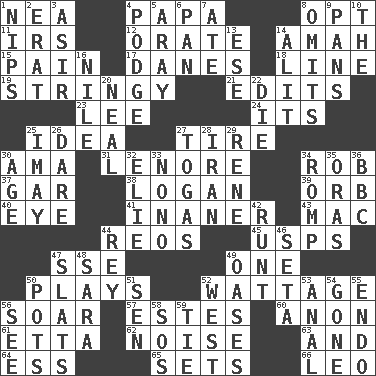 ACROSS 1. Teachers' org. 4. Dad 8. Choose 11. Big collection agency 12. Speak pompously 14. Wet nurse 15. Ache 17. Natives or inhabitants of Denmark 18. Actor's bit 19. Slender, wiry 21. Prepares for publication 23. Area sheltered from the wind 24. ___ a Wonderful Life 25. The content of cognition 27. Hoop that covers a wheel 30. Nanny (var.) 31. Poe poem 34. Director Reiner 37. Slender fish 38. Utah city north of Ogden 39. Globe 40. Sight organ 41. Sillier 43. Apple computer (short form) 44. Vintage cars 45. United States Postal Service (abbr.) 47. Compass dir. 49. Single 50. Frolics 52. Electrical Measurement 56. Fly high 57. _____ Park, CO 60. Soon (poet.) 61. Singer James 62. Annoying sound 63. Added to 64. Double-curved letter 65. Puts into a specified state 66. Lion DOWN 1. Pinches, bites 2. Part of Q.E.F. 3. SW Saudi Arabia district 4. Plash 5. Like ___ of sunshine 6. Baking dish 7. Had dinner 8. Leaves out 9. Baking dishes 10. Definite Article 13. Compass dir. 14. Came down and settled, as after flight 16. Mediterranean tributary 20. Actress Patricia 22. Expire 25. "If ____ say so..." 26. Have the gumption 27. Ancient Roman robes 28. SW Asia republic 29. French philosopher Descartes 30. Personal question 32. Writer Wiesel 33. Words to Nanette 34. Frolic 35. Mouths or openings 36. English channel? 42. Undersized animal 44. Marina Del _, California 46. Stalk of a moss capsule 47. Narrow boards 48. "Two Mules for Sister ____" 49. Fertile tracts in a desert 50. Cooking vessels 51. Elected rep. 52. 270 degrees 53. Of or related to the anus 54. Went 55. Inside; within (prefix) 56. Observe 58. Mayday 59. Make a knot