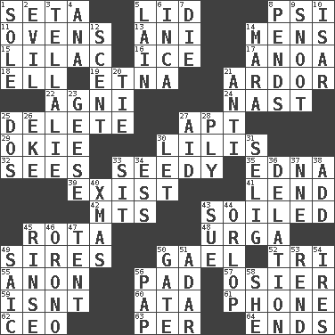 ACROSS 1. Bristle 5. Hat (slang) 8. Air pressure measure (abbr.) 11. Baking chambers 13. Black tropical American cuckoo 14. Not women's 15. Pale purple color 16. Frozen water 17. Small Philippine buffalo 18. Pipe bend 19. Inactive volcano in Sicily 21. Zeal 22. Hindu god of fire 24. Political cartoonist Thomas 25. Erase 27. Fitting 29. Migrant worker of the '30s 30. Ms. Damita and namesakes 32. Perceives with the eye 33. Shabby and untidy 35. Pulitzer Prize-winning author Ferber 39. Be extant 41. Grant temporary use of 42. Mountains (abbr.) 43. Dirtied 45. Roll call or roster of names 48. Capital and largest city of Mongolia 49. Fathers 50. Highlander 52. Three (prefix) 55. Soon (poet.) 56. Writing tablet 57. Flexible twig of a willow tree 59. Is not 60. "One Day ___ Time" 61. Give a jingle 62. Corporate head (abbr.) 63. For each 64. Extremities DOWN 1. Not divided or shared with others 2. Morally bad or wrong 3. Copy Pinocchio 4. Santa ___, CA 5. (Had) reclined 6. South American Indian 7. Expire 8. Hangs 9. Snout, nose 10. Austrian river, tributary to the Danube 12. Odor 14. Hindu Mythology: god of death 20. Make a knot 21. Against 23. Honkers 25. Two (Sp.) 26. Supplement with great effort 27. Help 28. Strand of rope, yarn or thread 30. Allow 31. Major League Baseball Commissioner Bud 33. Be seated 34. Curvy letter 36. Conveyance 37. Compass dir. 38. Increase 40. Dec. holiday 43. Institute legal proceedings 44. Lowest deck of a ship 45. Wash lightly 46. U. of Maine site 47. Portable shelter 49. Ketch in the Levant 50. Yard entry 51. The sixth month of the Jewish calendar 53. Tear apart 54. Angers 56. Infant food 58. A female animal or person