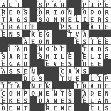 ACROSS 1. The first octave above the treble staff 4. Coast Guard woman 8. Corncob 12. Vintage cars 14. Greek mythologigal hunter 16. Scent 17. Labels 18. Wine waiters 20. Feeling or showing extreme anger 22. Air pressure measure (abbr.) 23. Had dinner 24. Followers of ems 25. Cask 28. Federal power corp. 30. Period of immesurable duration 31. First name in cosmetics 35. Experiment locale 37. Connecting point 40. Small amounts or degrees 41. Indian skirt 42. Grin 44. Writer Wiesel 45. Mild oath 46. Nights before holidays 47. Portuguese money of account (variant) 48. NE Netherlands city 50. Crow sounds 52. Two (Sp.) 54. Third day of the wk. 55. Mouth edge 58. Call ___ day 61. ___ Haven, CT 63. Swap 65. Pieces 70. An important port of Yemen 71. Makes supply last 72. Natives or inhabitants of Denmark 73. Enthusiasm 74. Incision 75. French philosopher Descartes 76. Raised railways DOWN 1. Nick name for Arthur 2. Memorize 3. Ancient Roman robes 4. Distress signal 5. Adept person 6. Direct toward a target or goal 7. Play 8. Luau course 9. The main thing one is thinking about 10. Sweet dark-red dessert wine 11. Celtic language 13. Fast jet (abbr.) 15. A home for chicks 19. Moving, as bait 21. Make supply last 26. Immeasurably long periods of time 27. Dwarf 29. Michaelmas daisies 30. Remained 32. Lie 33. Singer Brickell 34. Compass dir. 35. Falls behind 36. Ancient river in northeast Turkey 38. HTML Container Element 39. Voters do this 41. Ocean 43. He sold his birthright 49. Words to Nanette 51. Dripping 53. Transmit 55. Dipping utensil 56. Perfect 57. Actor Sean's family 58. On the rocks 59. Casino tip 60. So be it 62. Put on (as clothing) 64. Actress Charlotte 66. Pacific Standard Time (abbr.) 67. Compass dir. 68. "___ Little Indians" 69. Compass dir.