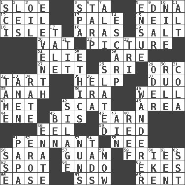 ACROSS 1. A type of plum 5. R.R. building 8. Pulitzer Prize-winning author Ferber 12. To provide with a ceiling 13. Light colored 15. Famous astronaut Armstrong 16. Small island 18. Caspian sea tributary 19. Table seasoning 20. Large container 22. Photo 24. Writer Wiesel 26. "We ___ not amused" (Victoria) 27. Remaining after all deductions 28. Indian title of respect (Mr.) 29. The grampus (Milton) 32. Small pie 35. Assist 37. Superhero pair 38. Wet nurse 39. Retirement account (abbr.) 40. Not ill 41. Was introduced to 42. Jazz singing style 43. Type of rug 44. Compass dir. 45. Again 46. Merit 49. Snakelike fish 50. Passed on 51. Pre-World Series prize 55. Born 56. "Two Mules for Sister ____" 57. Island territory of the United States 59. Strips of potato fried in deep fat 63. Blemish 64. Inside; within (prefix) 65. Makes supply last 66. Comfort 67. Compass dir. 68. Monthly bill DOWN 1. _-fi 2. French article 3. Lubricate 4. Veterans Day date 5. Health resort 6. Canvas cover 7. Mountain range southwest of Kyrgyzstan 8. Follow as a consequence or result 9. Letter starter 10. The longest river in the world 11. Keyboard modifier key 14. Fortification 17. Lie 21. Teat (slang) 23. Three (prefix) 25. Principles of right and wrong 28. Scheduled 29. Baltic tributary 30. General guideline 31. Root beer relative 32. Docile 33. So be it 34. Assign a rank or rating to 36. Epoch 40. Nomad 42. Fodder prepared in a silo 45. Benjamin's nick name 47. The 18th letter of the Arabic alphabet 48. Coral collection 49. Maternal 51. Dad 52. Greek god of love 53. Religious women 54. Small boys 56. Compass dir. 58. Cut the grass 60. D.D.E's nickname 61. Car or cant ending 62. Fast jet (abbr.)