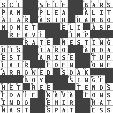 ACROSS 1. _-fi 4. Automatically 8. Long, evenly shaped pieces 12. Baking dish 13. Entreaty 14. Came down and settled, as after flight 15. Having or resembling wings 17. SW Saudi Arabia district 18. Role for Stallone 19. Music written for nine 21. Connecticut Ivy Leaguer 23. Cleo's killer 24. Break or tear apart 26. Mischievous child 28. Assign a rank or rating to 30. Nestling 34. Altar cloth linen 37. Edible starchy tuberous root 39. Small Philippine buffalo 40. Eastern Standard Time (abbr.) 41. Originate 43. Uncastrated adult male sheep 44. Den 46. Locale of original sin 47. Single 48. Moved like an arrow 51. Neighbor of Neb. 54. Male child 55. Scorch 58. Was introduced to 61. Portuguese money of account (variant) 63. Is inclined (to) 65. Peak District village in England 67. Polynesian shrub of the pepper family 71. Immeasurably long periods of time 72. Southeast Asian peninsula 73. Independent ruler or chieftain 74. Floor covering 75. Political cartoonist Thomas 76. Petty quarrel 77. Curvy letter DOWN 1. Connect, as a bridge 2. Bodily heat indicating an inflammation 3. Silly 4. Health resort 5. Raised railways 6. Flowery wreath 7. Conductor's collection 8. Sound made by sheep 9. _ mater 10. Teases 11. Close up, plug up 16. Tail end 18. Basketball hoops 20. Federal power corp. 22. Untruth 25. Singer James 27. Parent Teacher Assoc. 29. Having ears or earlike features 30. Olfactory organs 31. To the inside or interior of 32. Part of speech 33. Stare wonderingly 34. Actor Lugosi 35. Austrian river, tributary to the Danube 36. Commotion 38. To free from 42. Extremities 45. Director Reiner 49. Had on 50. Sight organ 52. Small island 53. Leg joint 56. Dwarf 57. Ferber et al. 58. Chow _ 59. Pulitzer Prize-winning author Ferber 60. Bits 62. Supplements with great effort 64. Fast planes 66. Car dealer's back yard 68. Electrical Unit 69. By way of 70. Tate display