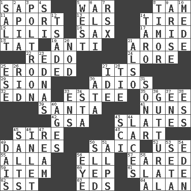 ACROSS 1. Plant excrements 5. Armed conflict 8. Scottish cap 11. To the left, to Queeg 13. Raised railways 14. Hoop that covers a wheel 15. Ms. Damita and namesakes 16. Saxophone 17. Among 18. Make lace 19. Against 21. Came up 22. Redecorate 24. Old wives' tales, e.g. 25. Worn away 27. ___ a Wonderful Life 29. The Jewish people; Israel 30. Goodbye (Sp.) 32. Pulitzer Prize-winning author Ferber 33. First name in cosmetics 35. Double curve, resembling the letter S 39. Before Barbara or Clara 41. Religious women 42. Girls' org. (abbr.) 43. Chalkboards 45. The founder of a family 48. Heavy open wagon 49. Natives or inhabitants of Denmark 50. Ketch in the Levant 52. Purpose 55. Silent film actress Nazimova 56. Pipe bend 57. Having ears or earlike features 59. A distinct part 60. Slangy assent 61. Chalkboard 62. Fast jet (abbr.) 63. Begley and Asner 64. ____ Jay Lerner DOWN 1. Table seasoning 2. Capital of Western Samoa 3. Coward 4. Indian title of respect (Mr.) 5. Compass direction 6. Mountain range southwest of Kyrgyzstan 7. Acura sports coupe 8. Southeast Indonesia island 9. Ascend 10. Ancient Persian 12. Sadhe (variant) 14. Pacific island yam 20. Lower and raise head in agreement 21. In addition 23. Ferber et al. 25. Compass dir. 26. To free from 27. Binary compound 28. Neckwear 30. _ moment's notice (2 wds.) 31. Echolocation 33. Followers of ems 34. R.R. building 36. From the throat 37. Compass dir. 38. Double-curved letter 40. Matures 43. _-fi 44. Shoestrings 45. Table seasonings 46. An arm off of a larger body of water 47. 480, 500 or 516 sheets of paper 49. Raised platform 50. Downhill vehicle 51. High mountains 53. Bristle 54. Locale of original sin 56. Sight organ 58. According to