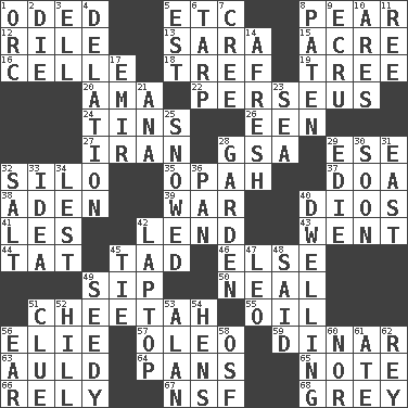 ACROSS 1. Wrote a lyric poem 5. And so on (abbr.) 8. Lightbulb-shaped fruit 12. Cause heat under the collar 13. "Two Mules for Sister ____" 15. 1/640 square mile 16. Cell (Danish) 18. Unclean, religiously 19. Relationship diagram 20. Nanny (var.) 22. Son of Zeus who helped slay Medusa 24. Metal containers 26. Car or cant ending 27. SW Asia republic 28. Girls' org. (abbr.) 29. Compass dir. 32. Grain storage tower 35. Brightly colored fish 37. ___ good deed 38. Arabian gulf 39. Armed conflict 40. "Vaya con ____" 41. French article 42. Grant temporary use of 43. Left 44. Make lace 45. Bit 46. Otherwise 49. Small drink 50. Be tempered by heat 51. Leopard's kin 55. Petroleum 56. Writer Wiesel 57. Margarine 59. Middle Eastern gold or silver currency 63. Old (Scot.) 64. Baking dishes 65. Musical sound 66. Trust 67. Overdraft (abbr.) 68. Jennifer or Joel DOWN 1. The grampus (Milton) 2. Pass on 3. Pipe bend 4. Accusation by an informer 5. Eastern Standard Time (abbr.) 6. Canvas cover 7. Algonquian 8. Eucharist need 9. Shade of tan 10. Ancient Greek god of war 11. Portuguese money of account (variant) 14. Anew 17. Arab leader 21. Santa ___, CA 23. Ocean 25. Overwhelmed 28. Place where plants grow 29. Singer Brickell 30. Within a short period 31. Compass direction 32. Table seasoning 33. The main thing one is thinking about 34. For fear that 36. Baking dish 40. Residence 42. Portable computer 45. Make a knot 47. Lion 48. Expressed in words 49. Full of seeds 51. A slight indication 52. Land elevation 53. ____ Jay Lerner 54. Coop moms 56. Ewer handle 58. Order of Saint Francis (abbr.) 60. Or not 61. Had dinner 62. Marina Del _, California