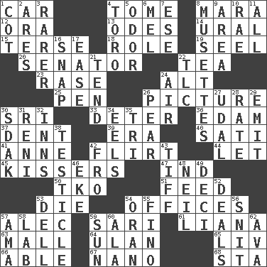 ACROSS 1. 4-wheeled motor vehicle 4. Heavy book 8. Hindu Mythology: god of death 12. Mouth or opening 13. Lyric poems 14. Mountain range 15. Laconic 18. Hero or heavy, e.g. 19. Stitch closed the eyes of (a falcon) 20. Elected representative 22. Beverage made from leaves 23. To erase 24. The first octave above the treble staff 25. Fenced enclosure 26. Photo 30. Indian title of respect (Mr.) 33. Prevent from occurring 36. Dutch treat 37. Scratch 39. Epoch 40. Suttee (variant) 41. Queen of England 1702-14 42. Talk or behave amorously 44. Allow 45. Smoochers 47. Indiana (abbr.) 50. Ring climax 51. Nourish 53. Expire 54. Public positions 57. Actor Baldwin 59. Indian skirt 61. Woody, climbing, usually tropical plant 63. Promenade 64. ____ Bator, Mongolia 65. 54 in ancient Rome 66. Competent 67. Billionth: prefix 68. R.R. building DOWN 1. Small bed 2. Ancient Greek god of war 3. More valued for its uncommonness 4. "Corrida" creature 5. Aroma 6. Cartoonist voice _ Blanc 7. Compass dir. 8. French bagpipes 9. Length times width 10. Actress Charlotte 11. 100% 16. Fastener 17. Comfort 21. Look after 22. Affectionate concern, for short 24. Wind 26. Lightbulb-shaped fruit 27. Allodial 28. Assign a rank or rating to 29. Give off 30. Neighbor of Neb. 31. Painter Guido (1575-1642) 32. Lodging establishments 34. Snakelike fish 35. Three (prefix) 38. A testis 42. Back 43. Small quarrel 46. Make supply last 48. Famous astronaut Armstrong 49. Tenth: prefix 52. Allots cards 53. Small valley 54. NW Algerian seaport 55. A pale, very dry sherry 56. In a ____ (agitated or irritated) 57. Wet nurse (var.) 58. Experiment locale 59. Player for Phoenix 60. Wing 62. Actress Gardner