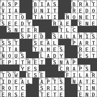 ACROSS 1. Cleo's killer 4. Prejudice 8. Naughty child 12. By way of 13. A single undivided whole 14. Make new 15. "Tell ____ the Marines!" 17. Jacques of French films 18. Music written for nine 19. Morally degraded 21. Actress Charlotte 23. Compass dir. 24. Scornful expression 26. Affectionate concern, for short 28. Hurried 30. Deli grouping 34. Fast jet (abbr.) 37. Lick closed 39. Role in a play 40. Call ___ day 41. Corrects by punishment or discipline 43. To separate or throw off 44. Common sense 46. Kenny Rogers chart-topper in '80 47. Eastern Standard Time (abbr.) 48. Curse 51. Fastener 54. It is so 55. Dice game 58. Pull behind 61. Compass dir. 63. Of or pertaining to a thread or threads 65. Perfect 67. Flats, for short 71. Nathan's nickname 72. College mil. group 73. Indian titles of respect 74. Metal container 75. Celtic language 76. Wig 77. Conclusion DOWN 1. Advice 2. Locates 3. Eucharist need 4. On the contrary 5. _ tizzy (2 wds.) 6. Small island 7. Use a spoon 8. Sis' sibling 9. French philosopher Descartes 10. Arabian gulf 11. Lug 16. Lyric poems 18. 1994 drama film starring Jodie Foster 20. Slangy assent 22. "One Day ___ Time" 25. Relief 27. Head covering 29. Started a card game 30. Bobsleighs 31. Female horse 32. Angers 33. Proofreading order 34. Trig term 35. Obstruct or block passage 36. "Change" in Tahitian 38. Wet nurse (var.) 42. Synchronize (abbr.) 45. Filthy place 49. Person who is morally reprehensible 50. Curvy letter 52. Sandy's bark 53. Ache 56. Food holder 57. Smooth fabric 58. Become fatigued 59. Scent 60. Moistens 62. Compass direction 64. Tear apart 66. Adept person 68. Before (prefix) 69. Teat (slang) 70. Compass dir.