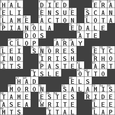 ACROSS 1. Actor Linden 4. Passed on 8. Period 11. Connecticut Ivy Leaguer 12. Follow as a consequence or result 14. Skim 15. Unable to walk 17. 13-14th century defensive garment 18. Globular water bottle used in Asia 19. Player piano 21. Peak District village in England 23. Two (Sp.) 24. Had dinner 25. Hoof sound 27. Like ___ of sunshine 30. Flowery wreath 31. Sounds asleep 34. And so on (abbr.) 37. Indiana (abbr.) 38. From or relating to Ireland 39. 17th letter of the Greek alphabet 40. It is 41. Soft color 43. Nonscientific branch of learning 44. Small island 45. Von Bismarck 47. Possessed 49. Raised railways 50. Person of subnormal intelligence 52. Deli grouping 56. Not wild 57. _____ Park, CO 60. Travel on or in a vehicle 61. At sea 62. Compose 63. Area sheltered from the wind 64. Mountains (abbr.) 65. Slanted text style (abbr.) 66. Pet locale DOWN 1. Assist 2. Mountain range southwest of Kyrgyzstan 3. Pale green bean 4. Allots cards 5. South American Indian 6. Eastern Standard Time (abbr.) 7. Superhero pair 8. Learning spot: Fr. 9. Pace 10. Santa ___, CA 13. Compass dir. 14. Narrow board 16. Inside; within (prefix) 20. I made a mistake 22. 24 hours 25. Penny 26. Flaplike coverings 27. Originate 28. Repose 29. American tennis player Robert 30. Cards in a Roman deck? 32. Cuts off 33. Relating to the mouth 34. Part of Q.E.F. 35. Through, poetically 36. Small bed 42. Hang loosely or laxly 44. Wedding promise 46. Russian ruler of old 47. Residences 48. Type of rug 49. Artist's stand 50. Vertical spar for supporting sails 51. ___ Haven, CT 52. Stalk of a moss capsule 53. Place where flour is made 54. It may be bright or harebrained 55. Ooze 56. Scottish cap 58. Indian title of respect (Mr.) 59. Teat (slang)