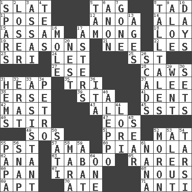 ACROSS 1. Narrow board 5. Label 8. Small boy 11. Introduce or present, as a question 12. Small Philippine buffalo 14. Chicken ___ king 15. Indian state 17. Amid 18. Myrna of the movies 19. Thinks logically 21. Born 22. French article 23. Indian title of respect (Mr.) 24. Allow 25. Fast jet (abbr.) 27. Compass dir. 28. Crow sounds 31. Pile 35. Three (prefix) 37. Toward shelter 38. Celtic language 39. R.R. building 41. Incision 42. Vertical spar for supporting sails 43. 100% 45. Fast planes 46. Use a spoon 47. Greek goddess of the dawn 49. Distress signal 51. Before (prefix) 52. Floor covering 55. Pacific Standard Time (abbr.) 57. Nanny (var.) 60. Player piano 62. Santa ___, CA 63. Off limits 65. More valued for its uncommonness 66. Baking dish 67. SW Asia republic 68. Horse sense 69. Fitting 70. Had dinner 71. Against DOWN 1. Practice fights 2. Failure 3. Slender Brazilian palm 4. Afternoon social gatherings 5. Scottish cap 6. Soon (poet.) 7. Went 8. Baron Munchausen's specialties 9. Medicinal plant 10. 24-hour periods 13. Grows older 16. Undercover agent 17. Michaelmas daisies 20. A home for chicks 26. Loads 29. Gone 30. Arranges properly for use 31. Is hesitant and indecisive 32. Part of Q.E.F. 33. Helper 34. Stone: prefix 36. Call ___ day 40. City in Syria 44. Australian parrot (variant) 48. Wither 50. Suttee (variant) 52. Person of subnormal intelligence 53. Native American of Southwest Alaska 54. Tarsus (plural) 55. Dad 56. Fastener 58. Hindu Mythology: god of death 59. Blind as ____ 61. Nanny 64. Single