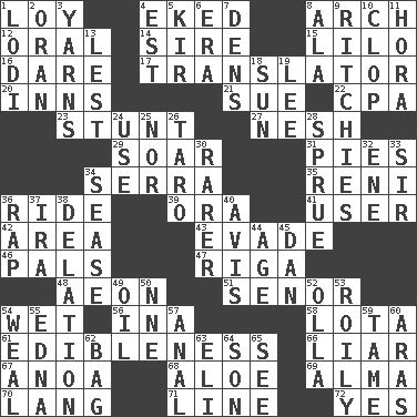 ACROSS 1. Myrna of the movies 4. Made supply last 8. Bowlike part 12. Taken by mouth 14. Title for a man of rank and authority 15. _ and Stitch 16. Have the gumption 17. Interpreter 20. Taverns 21. Institute legal proceedings 22. Numbers guy (abbr.) 23. Difficult or unusual or dangerous feat 27. Tender 29. Fly high 31. Sliced desserts 34. Spanish missionary in California 35. Painter Guido (1575-1642) 36. Travel on or in a vehicle 39. Mouth or opening 41. One who makes use of a thing 42. Length times width 43. Dodge 46. Friends 47. Capital of Latvia 48. Period of immesurable duration 51. Sir (Sp.) 54. Dripping 56. _ tizzy (2 wds.) 58. Globular water bottle used in Asia 61. The property of being fit to eat 66. One who doesn't tell the truth 67. Small Philippine buffalo 68. Medicinal plant 69. _ mater 70. Long (Scottish) 71. Actor's bit 72. Affirmative reply DOWN 1. Farming town in central California 2. Northwest Algerian city 3. Tall tales 4. Eastern Standard Time (abbr.) 5. Apertif with cassis 6. Epoch 7. Habitations of wild animals 8. According to 9. Actors Guy, Robert Welles, and Clint 10. Hoof sound 11. Israeli folk dance 13. For fear that 18. Player for Phoenix 19. Area sheltered from the wind 24. Purpose 25. Or not 26. Pacific island yam 28. Upset 30. More uncommon 32. Compass dir. 33. Title for a knight 34. Gospel singer Marvin 36. Reproach for some lapse or misdeed 37. Retirement account (abbr.) 38. Accusation by an informer 40. Deliberation 44. Grow older 45. One of the 12 tribes of Israel 49. Lubricate 50. Compass dir. 52. Spanish pot 53. Turbulent 54. Welt 55. Pulitzer Prize-winning author Ferber 57. Of or related to the anus 59. Not wild 60. Ancient river in northeast Turkey 62. Paper or plastic container 63. Biblical high priest 64. Male offspring 65. Perceive with the eye