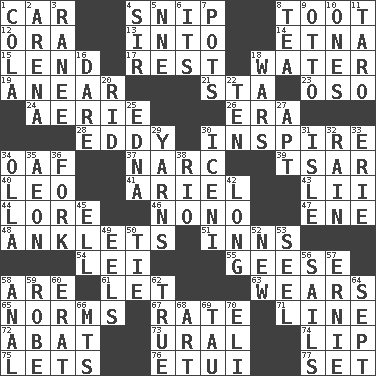 ACROSS 1. 4-wheeled motor vehicle 4. Sever or remove by pinching or nipping 8. A blast of a horn 12. Mouth or opening 13. To the inside or interior of 14. Inactive volcano in Sicily 15. Grant temporary use of 17. Remainder 18. Wetness 19. Approach 21. R.R. building 23. Bear (Spanish) 24. Nest on high 26. Epoch 28. Whirlpool 30. Stimulate to action 34. Clumsy lout 37. Drug cop 39. Russian ruler of old 40. Lion 41. Satellite of Uranus 43. Cards in a Roman deck? 44. Old wives' tales, e.g. 46. Words to Nanette 47. Compass dir. 48. Short socks 51. Restaurants 54. Luau accessory 55. Honkers 58. "We ___ not amused" (Victoria) 61. Allow 63. Erodes 65. Typical models 67. Pace 71. Actor's bit 72. Blind as ____ 73. Mountain range 74. Mouth edge 75. Allows 76. Needle case 77. Arrange properly for use DOWN 1. Root beer relative 2. Sports stadium 3. Indian princess (variant) 4. Title for a knight 5. Compass dir. 6. ___ a Wonderful Life 7. Plant holders 8. Afternoon social gathering 9. "Beetle Bailey" pooch 10. Singles 11. Pacific island yam 16. Have the gumption 18. Armed conflicts 20. To free from 22. "___ Little Indians" 25. Pulitzer Prize-winning author Ferber 27. Fitting 29. Tall tales 30. Ancient Celtic tribe of eastern Britain 31. Capri or Wight 32. Precipitation 33. One of the Great Lakes 34. Rounded earthenware pot or jar 35. Age 36. Tined utensil 38. _ de Janeiro 42. Yearn 45. Pipe bend 49. Snakelike fish 50. Make a knot 52. ___ Haven, CT 53. Sew up the eyelids of hawks and falcons 56. Travel by water 57. Bert's buddy 58. Of or related to the anus 59. Loose flowing garment 60. Part of Q.E.F. 62. Loyal 64. Back-to-school mo. 66. Mountains (abbr.) 68. Tate display 69. The 19th letter of the Greek alphabet 70. Connecticut Ivy Leaguer
