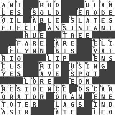 ACROSS 1. Black tropical American cuckoo 4. Friend of Pooh 7. ____ Bator, Mongolia 11. French article 12. Exchanged or delivered for money 13. Eat (away) 14. Lubricate 15. Competent 16. Chalkboards 17. Choose 19. Helper 21. Sorrow 23. Woody plant 24. Conductor's collection 25. "We ___ not amused" (Victoria) 26. Biblical high priest 29. Film actor Errol 30. Again 31. Large container 32. River (Sp.) 33. Mouth edge 34. Followers of ems 35. Raised railways 36. To free from 37. Exploiting 40. Affirmative reply 41. "___ Maria" 42. Specific locale 43. Old wives' tales, e.g. 45. A really long time 46. Dwelling 51. Motion picture award 55. Speaker 56. Northwest Algerian city 58. Compass dir. 59. Carrier 60. Fails to keep up a pace 61. Working for oneself (abbr.) 62. SW Saudi Arabia district 63. Had dinner 64. Lion DOWN 1. _ vera 2. Famous astronaut Armstrong 3. Capri or Wight 4. Director Reiner 5. Rounded earthenware pot or jar 6. Lyric poems 7. A salt of uric acid 8. Globular water bottle used in Asia 9. An important port of Yemen 10. A home for chicks 12. Titan orbits this 13. Otherwise 16. Founders of families 18. Supercomputer manufacturer 20. Empty completely 22. Car or cant ending 24. Soft thread for cleaning between teeth 25. Tolerate 26. Incident 27. Long (Scottish) 28. ___ a Wonderful Life 29. Do some clerical work 32. Marina Del _, California 33. Make or become more lively 36. More valued for its uncommonness 37. Purpose 38. Soup utensils 39. Charged particles 43. 61 cubic inches 44. Scent 46. Round or rotation of duties 47. Greek god of love 48. Suttee (variant) 49. Root beer relative 50. Part of Q.E.F. 52. To provide with a ceiling 53. Singer Murray 54. Do over again 57. Ripen