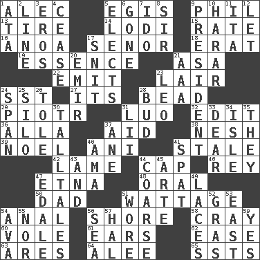 ACROSS 1. Actor Baldwin 5. Armor plate that protects the chest 9. Silvers or Donahue 13. Hoop that covers a wheel 14. Farming town in central California 15. Pace 16. Small Philippine buffalo 17. Sir (Sp.) 18. Part of Q.E.F. 19. Substance 21. White ___ sheet 22. Give off 23. Den 24. Fast jet (abbr.) 27. ___ a Wonderful Life 28. Necklace unit 29. Peter (Polish) 31. Nilotic language 32. Prepare for publication 36. Silent film actress Nazimova 37. Assist 38. Soft 39. Christmas carol 40. Cuckoo 41. Having lost freshness 42. Unable to walk 44. Head covering 46. Marina Del _, California 47. Inactive volcano in Sicily 48. Relating to the mouth 50. June honoree 51. Electrical Measurement 54. Of or related to the anus 56. Dinah or Pauly 58. Supercomputer manufacturer 60. Grand slam 61. Hearing organs 62. Relaxation 63. Ancient Greek god of war 64. Toward shelter 65. Fast planes DOWN 1. _ moment's notice (2 wds.) 2. Actor's bit 3. Greek god of love 4. Stop 5. Chooses 6. Went 7. Wedding promise 8. Title for a knight 9. Elected leader of a country 10. Ethiopian city, capital of Harari 11. Call ___ day 12. Allow 17. In a ____ (agitated or irritated) 20. Independent ruler or chieftain 21. American Automobile Association (abbr.) 23. Lion 24. Connect, as a bridge 25. Grain storage tower 26. Lacquered or enameled metalware 28. Partially opened flower 30. Baron Munchausen's specialties 31. Cards in a Roman deck? 33. Letter starter 34. Capri or Wight 35. Those things 37. A saturated hydrocarbon 40. Nanny (var.) 41. Petty quarrel 43. Also 44. Unrefined 45. Johnson of "Laugh-In" 47. Peak District village in England 49. Shoestrings 51. Had on 52. Pate de foie ____ 53. Compass direction 54. Actress Gardner 55. Not either 56. Ocean 57. Actor Linden 59. Consenting reply