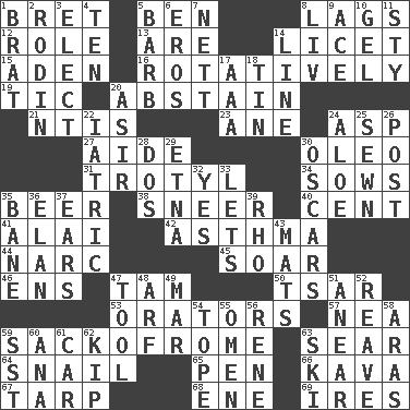 ACROSS 1. Cy Young winner Saberhagen 5. Benjamin's nick name 8. Falls behind 12. Hero or heavy, e.g. 13. "We ___ not amused" (Victoria) 14. It is permitted: Lat. 15. An important port of Yemen 16. Happening in regular succession 19. Nervous spasm 20. Choose not to consume 21. Nuclear Threat Initiatives 23. One (Scot) 24. Cleo's killer 27. Assistant 30. Margarine 31. Trinitrotoluene 34. Sty mamas 35. Fermented drink made from hops 38. Scornful expression 40. Penny 41. Jai ____ 42. Respiratory problem 44. Drug cop 45. Fly high 46. Followers of ems 47. Scottish cap 50. Russian ruler of old 53. Speakers 57. Teachers' org. 59. Italian handbag shop? 63. Burn superficially 64. Slow-paced one 65. Writing instrument 66. Polynesian shrub of the pepper family 67. Canvas cover 68. Compass dir. 69. Angers DOWN 1. Naughty child 2. "The Thinker" sculptor 3. Voters do this 4. "___ Little Indians" 5. Sharp remark 6. Greek god of love 7. Remaining after all deductions 8. 54 in ancient Rome 9. Adept person 10. Set 11. Filthy place 14. Actor's bit 17. American Automobile Association (abbr.) 18. Shallow baking pan 20. SW Saudi Arabia district 22. Of or pertaining to medicine 24. Medicinal plant 25. Stitched 26. Mail 28. Two (Sp.) 29. Inactive volcano in Sicily 30. Motion picture awards 32. Affirmative reply 33. Allows 35. Object of repulsion 36. Flair 37. Hearing organs 39. 17th letter of the Greek alphabet 43. Floor protectors 47. Instrument 48. Sandy's bark 49. Impair 51. Approach 52. Break or tear apart 54. Drink excessively 55. Presage 56. French philosopher Descartes 58. Caspian sea tributary 59. Fast jet (abbr.) 60. Santa ___, CA 61. Automobile 62. Sleep 63. What Jean-Claude Killy likes to do