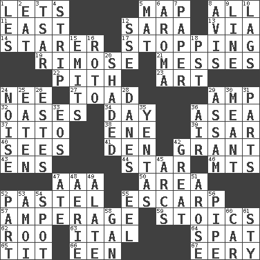 ACROSS 1. Allows 5. Atlas unit 8. 100% 11. 90 degrees 12. "Two Mules for Sister ____" 13. By way of 14. A viewer who gazes fixedly 17. Ceasing 19. Full of chinks, cracks, or crevices 21. Makes clutter 22. Heart or essence 23. Tate display 24. Born 27. Frog relative 29. Electrical Unit 32. Fertile tracts in a desert 34. 24 hours 36. Toward the sea 37. "Tell ____ the Marines!" 38. Compass dir. 39. Austrian river, tributary to the Danube 40. Observes 41. Lair 42. Let have 43. Followers of ems 44. Play the lead 46. Mountains (abbr.) 47. Auto club (abbr.) 50. Type of rug 52. Soft color 55. Fortification 57. Electrical Measurement 59. Unemotional ones 62. Friend of Pooh 63. Slanted text style (abbr.) 64. Petty quarrel 65. Teat (slang) 66. Car or cant ending 67. Suggestive of the supernatural DOWN 1. French article 2. Erode 3. Russian ruler of old 4. Long narrow piece of something 5. Floor protector 6. Odor 7. Some stationery 8. Opinion 9. Actor's bit 10. Falls behind 12. Compass dir. 15. Sends forth 16. Printing process, for short 18. Pacific Standard Time (abbr.) 20. Cast a shadow over 24. Annoying sound 25. Ingested 26. _____ Park, CO 28. Natives or inhabitants of Denmark 29. Indian state 30. Intended 31. Actors' quests 33. Greek goddess of the dawn 35. Gossips 36. Atmosphere 42. Relatively large 45. Arches 47. Had dinner 48. Nest on high 49. Having winglike extensions 51. Came up 52. Component 53. Mine, in Marseilles 54. Blemish 55. Snakelike fish 56. Corncob 58. Separate the seeds from cotton 60. Auto 61. Filthy place