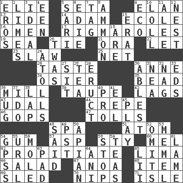 ACROSS 1. Writer Wiesel 5. Bristle 9. Style 13. Travel on or in a vehicle 14. First of billions? 15. Learning spot: Fr. 16. Sign of things to come 17. Frustrating wastes of time 19. Ocean 20. Make a knot 21. Mouth or opening 22. Allow 23. Cole _ (cabbage dish) 25. Fish or hair follower 26. Clothes sense 30. Queen of England 1702-14 34. Flexible twig of a willow tree 35. Necklace unit 36. Place where flour is made 39. Grayish beige 42. Falls behind 43. Allodial 44. Streamer paper 46. Republicans 47. For Whom the Bell _____ 48. Health resort 51. Tiny particle 54. Chewing product 57. Cleo's killer 58. Filthy place 60. Cartoonist voice _ Blanc 62. Appease 65. Pale green bean 66. Vegetable dish 67. Small Philippine buffalo 68. Detail 69. Downhill vehicle 70. Pinches, bites 71. Small island DOWN 1. Greek god of love 2. Citrus fruits 3. Perfect 4. Car or cant ending 5. Indian skirt 6. Singer Brickell 7. Label 8. ID or VA city 9. Environmental prefix 10. Hang loosely or laxly 11. Toward shelter 12. Egg locale 15. Part of Q.E.F. 18. "We ___ not amused" (Victoria) 20. It was, poetically 24. Ringlike coral islands and reefs 27. Be seated 28. Beverage made from leaves 29. Spew [out] 30. Most capable 31. Teachers' org. 32. Tired old horse 33. Begley and Asner 36. Large cup 37. Wedding promise 38. Infant locale 40. Adept person 41. Snakelike fish 45. Live dramatic performance 48. Expressed in words 49. Pacific Standard Time (abbr.) 50. Bee-related 52. Leaves out 53. Klaipeda city 54. Global Positioning Systems (abbr.) 55. Mountain range 56. Undercover agent 58. Halt 59. Afternoon social gatherings 61. Unable to walk 63. Groovy apt. 64. Black tropical American cuckoo 65. Cards in a Roman deck?