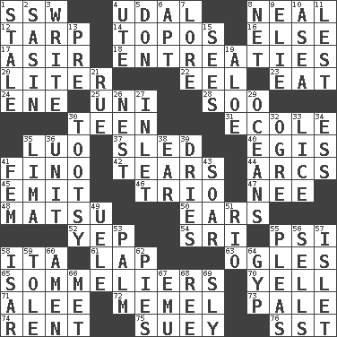 ACROSS 1. Compass dir. 4. Hereditary estate 8. Anneal 12. Canvas cover 14. Traditional theme or motif 16. Otherwise 17. SW Saudi Arabia district 18. Pleas 20. 61 cubic inches 22. Snakelike fish 23. Consume 24. Compass dir. 25. Corn or form start 28. "Barney Miller" actor Jack 30. Adolescent 31. Learning spot: Fr. 35. Nilotic language 37. Downhill vehicle 40. Armor plate that protects the chest 41. Fine (Spanish) 42. Lacerates 44. Arches 45. Send forth 46. Musical group of three 47. Born 48. Taiwanese island in East China Sea 50. Hearing organs 52. Slangy assent 54. Indian title of respect (Mr.) 55. 23rd letter of the Greek alphabet 58. Call ___ day 61. Pet locale 63. Stares 65. Wine waiters 70. Shout 71. Toward shelter 72. Klaipeda city 73. Diluted with white 74. Monthly bill 75. Chop _ 76. Fast jet (abbr.) DOWN 1. Showing deterioration from age 2. Indian antelope 3. Compose 4. Shoshoni 5. Spanish title 6. Fitting 7. Old wives' tales, e.g. 8. Fish or hair follower 9. Writer Wiesel 10. Toward the sea 11. For fear that 13. Before (prefix) 15. Observes 19. Medicinal plant 21. Sorrow 26. A home for chicks 27. An arm off of a larger body of water 29. Seas 30. A girl or young woman (variant) 32. Legendary monster 33. Louse (plural) 34. Curvy letter 35. Pale green bean 36. A single undivided whole 38. Hearing organ 39. Frees from moisture 41. Opposite of masc. 43. Fly high 49. Ubangi River tributary 51. River (Sp.) 53. Inside of hand 55. Entreaties 56. Exchanges for money 57. Small island 58. Austrian river, tributary to the Danube 59. Lacquered or enameled metalware 60. So be it 62. Sliced desserts 64. Swindle 66. Was introduced to 67. Australian flightless bird 68. Portuguese money of account (variant) 69. Playfully artful