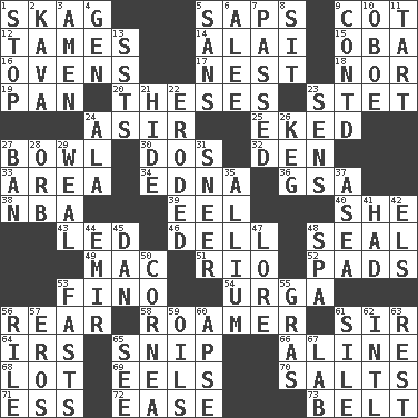ACROSS 1. Heroin 5. Plant excrements 9. Small bed 12. Makes less strong or intense 14. Jai ____ 15. Chief or king in Benin or Nigeria 16. Baking chambers 17. A home for chicks 18. And not 19. Baking dish 20. College papers 23. Proofreading order 24. SW Saudi Arabia district 25. Made supply last 27. Soup holder 30. Two (Sp.) 32. Lair 33. Length times width 34. Pulitzer Prize-winning author Ferber 36. Girls' org. (abbr.) 38. Basketball assoc. 39. Snakelike fish 40. A female animal or person 43. Directed 46. Small valley 48. Lick closed 49. Big _ 51. River (Sp.) 52. Writing tablets 53. Fine (Spanish) 54. Capital and largest city of Mongolia 56. Stern 58. Wanderer 61. Title for a knight 64. Big collection agency 65. Sever or remove by pinching or nipping 66. Place in a line 68. Car dealer's back yard 69. Snakelike fish 70. Table seasonings 71. Double-curved letter 72. Comfort 73. Waist strap DOWN 1. Cease 2. Polynesian shrub of the pepper family 3. So be it 4. Commissioned mil. rank 5. Without 6. Toward shelter 7. Went by 8. Be seated 9. Continued (abbr.) 10. Mitch Miller's instrument 11. Small pie 13. Fast planes 21. Flintstone garb 22. Worn away 23. Elected reps. 24. Chicken ___ king 26. Barrel 27. Forbid 28. Globe 29. Welt 31. Scornful expression 35. Plant genus of onion and garlic 37. Toward the sea 41. Possessed 42. Raised railways 44. Independent ruler or chieftain 45. Daniel's nick name 47. Old wives' tales, e.g. 48. Health resort 50. Pupil covering 53. Goes without food and/or water 55. Pate de foie ____ 56. Cause heat under the collar 57. Greek god of love 59. Petroleums 60. Domed church section 61. Drop; flow; fall 62. International (abbr.) 63. Relief 65. Perceive with the eye 67. Experiment locale