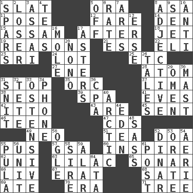 ACROSS 1. Narrow board 5. Mouth or opening 8. White ___ sheet 11. Introduce or present, as a question 12. Conductor's collection 14. Lair 15. Indian state 17. Following 18. _ stream 19. Thinks logically 21. Double-curved letter 22. Connecticut Ivy Leaguer 23. Indian title of respect (Mr.) 24. Car dealer's back yard 25. And so on (abbr.) 27. Compass dir. 28. Tiny particle 31. Halt 35. The grampus (Milton) 37. Pale green bean 38. Soft 39. Health resort 41. Nights before holidays 42. "Tell ____ the Marines!" 43. "We ___ not amused" (Victoria) 45. Transmitted 46. Adolescent 47. Music discs 49. Modern: prefix 51. Afternoon social gathering 52. ___ good deed 55. Fluid product of inflammation 57. Girls' org. (abbr.) 60. Stimulate to action 62. Corn or form start 63. Pale purple color 65. Echolocation 66. 54 in ancient Rome 67. Part of Q.E.F. 68. Suttee (variant) 69. Had dinner 70. Epoch 71. Relationship diagram DOWN 1. Practice fights 2. Failure 3. Slender Brazilian palm 4. Afternoon social gatherings 5. Below a satisfactory level 6. Assign a rank or rating to 7. Ancient Greek god of war 8. Descriptive word 9. Sew up the eyelids of hawks and falcons 10. Opposed to 13. Celtic language 16. Undercover agent 17. Michaelmas daisies 20. Words to Nanette 26. Stories 29. Sign of something about to happen 30. Vertical spar for supporting sails 31. In a ____ (agitated or irritated) 32. False hair 33. Clearly or manifestly demonstrative 34. Give a jingle 36. Accounting whiz (abbr.) 40. Northern region 44. Genesis locale 48. Backtalk 50. Stare 52. Middle Eastern gold or silver currency 53. Declaim 54. Nest on high 55. Monetary unit of Botswana 56. A single undivided whole 58. Title for a man of rank and authority 59. Having or resembling wings 61. Mail 64. _ moment's notice (2 wds.)
