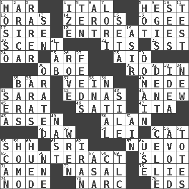 ACROSS 1. Make imperfect 4. Slanted text style (abbr.) 8. Behest 12. Mouths or openings 14. Nothings 16. Double curve, resembling the letter S 17. Male parent of an animal 18. Pleas 20. Odor 22. It is 23. Fast jet (abbr.) 24. Boat paddle 25. Sandy's bark 28. Help 30. Mitch Miller's instrument 31. "The Thinker" sculptor 35. Tavern 37. Distinctive style or manner 40. Ancient Persian 41. "Two Mules for Sister ____" 42. Ferber et al. 44. Afresh 45. Part of Q.E.F. 46. Suttee (variant) 47. Call ___ day 48. NE Netherlands city 50. ____ Jay Lerner 52. Obsolete 54. Flowery wreath 55. Domesticated feline 58. Quiet! 61. _ Lanka 63. New (sp.) 65. Frustrate 70. Notch 71. So be it 72. Rhinal 73. Writer Wiesel 74. Connecting point 75. Drug cop 76. Begley and Asner DOWN 1. With motion or animation 2. N. Chile seaport 3. More valued for its uncommonness 4. Ending with capital 5. Nine, plus one 6. Nonscientific branch of learning 7. Australian parrot (variant) 8. Being at a high temperature 9. The front part of a cuirass 10. Perceives with the eye 11. Trial 13. Elected rep. 15. Stalk of a moss capsule 19. SW Saudi Arabia district 21. Keyboard key 26. Be footloose 27. Gives food to 29. Realm 30. Declaimed 32. Scratch 33. The main thing one is thinking about 34. ___ Haven, CT 35. Long, evenly shaped pieces 36. Caspian sea tributary 38. _ tizzy (2 wds.) 39. Brizilian seaport 41. Ocean 43. Filth; sediment 49. Political cartoonist Thomas 51. The 18th letter of the Arabic alphabet 53. Songbird 55. Cell (Danish) 56. Shun 57. Hauls 58. Examine hastily 59. Same (prefix) 60. Took on color 62. SW Asia republic 64. Purpose 66. Compass dir. 67. White ___ sheet 68. Auto 69. Affectionate concern, for short