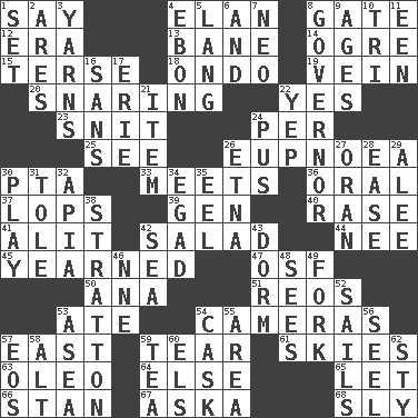 ACROSS 1. Declare 4. Liveliness 8. Yard entry 12. Epoch 13. Object of repulsion 14. Legendary monster 15. Laconic 18. Southwest Nigerian state 19. Distinctive style or manner 20. Catching in a trap 22. It is so 23. In a ____ (agitated or irritated) 24. For each 25. Observe 26. Normal relaxed breathing 30. Parent Teacher Association (abbr.) 33. Confronts 36. Relating to the mouth 37. Chops off 39. Commissioned mil. rank 40. To erase 41. Set down 42. First course 44. Born 45. Felt deep pity or tenderness 47. Order of Saint Francis (abbr.) 50. Santa ___, CA 51. Vintage cars 53. Had dinner 54. Devices for capturing images 57. Compass direction 59. Pull into pieces 61. Atmospheres 63. Margarine 64. Otherwise 65. Allow 66. Comedian Laurel of Laurel & Hardy 67. "____ silly question..." 68. Playfully artful DOWN 1. Put into a specified state 2. Ancient Greek god of war 3. Entertaining tales 4. Inky black, to poets 5. Austrian-born American filmmaker Fritz 6. Added to 7. Modern: prefix 8. Head of state? 9. Eons 10. Three (prefix) 11. Car or cant ending 16. Without 17. 4th largest of the Great Lakes 21. A whole individual unit 22. Slangy assent 24. Ichor 26. Inactive volcano in Sicily 27. NW Algerian seaport 28. Relaxation 29. Toward shelter 30. Frolic 31. Lacquered or enameled metalware 32. Capital of Western Samoa 34. Mild oath 35. Snakelike fish 38. Ski resort town in Vermont 42. Ocean 43. Dormintory (informal) 46. Compass dir. 48. Observes 49. Tined utensil 52. Moves on water 53. Toward the sea 54. Keg 55. Length times width 56. Stitch closed the eyes of (a falcon) 57. Greek goddess of the dawn 58. The first octave above the treble staff 59. Beverage made from leaves 60. Raised railways 62. Filthy place