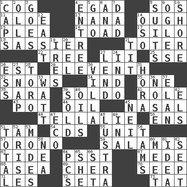 ACROSS 1. Gear tooth 4. Mild oath 8. Distress signal 11. Medicinal plant 13. Nanny 14. Ending for "Through" and "Enough" 15. Entreaty 16. Frog relative 17. Grain storage tower 18. More impudent 21. Carrier 22. Relationship diagram 23. Cards in a Roman deck? 25. Compass dir. 26. Eastern Standard Time (abbr.) 29. Veterans Day date 32. Frozen precipitation (plural) 34. Indiana (abbr.) 35. Single 38. "Two Mules for Sister ____" 39. Twentieth part of a lira 41. Hero or heavy, e.g. 43. Plant holder 44. Lubricate 45. Relating to the nose 46. Copy Pinocchio 50. Followers of ems 51. Scottish cap 54. Music discs 55. A single undivided whole 57. U. of Maine site 59. Deli grouping 63. Event that recurs at intervals 64. Inconspicuous attention getter 67. Ancient Persian 68. Toward the sea 69. "Mermaids" star 70. Ooze 71. French article 72. Bristle 73. Make lace DOWN 1. Smile enhancers 2. Spanish pot 3. Travels 4. Main course 5. E Mali city 6. Santa ___, CA 7. Male parent 8. Costumes for special activities 9. Stares at amorously 10. Dinah or Pauly 12. Compass direction 14. Bear (Spanish) 19. Angers 20. Snakelike fish 21. Teat (slang) 23. Grant temporary use of 24. _ china 26. Curvy letter 27. Fastener 28. "Corrida" creature 30. Country residence 31. Israeli folk dance 33. Electrical Unit 36. Characteristic smell of wine 37. Style 39. Exchanged or delivered for money 40. Petroleums 42. Raised railways 45. Famous astronaut Armstrong 47. Environmental prefix 48. A period of five years 49. _ tizzy (2 wds.) 51. "_____ Recall" 52. Originate 53. Methods 56. Scottish caps 58. Teachers' org. 60. Confront 61. The content of cognition 62. Back-to-school mo. 64. Personal Computers (abbr.) 65. A female animal or person 66. Arrange properly for use