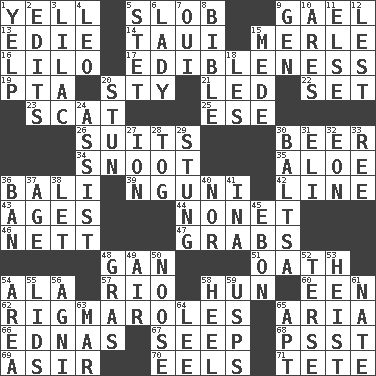 ACROSS 1. Shout 5. Oscar Madison type 9. Highlander 13. Singer Brickell 14. "Change" in Tahitian 15. Haggard of country music 16. _ and Stitch 17. The property of being fit to eat 19. Parent Teacher Assoc. 20. Filthy place 21. Directed 22. Arrange properly for use 23. Go away! 25. Compass dir. 26. Costumes for special activities 30. Fermented drink made from hops 34. Snob 35. Medicinal plant 36. Indonesian resort city 39. Group of southern Bantu languages 42. Actor's bit 43. Eras 44. Music written for nine 46. Remaining after all deductions 47. Catches 48. Separate the seeds from cotton 51. Pledge 54. Wing 57. _ de Janeiro 58. Attila the _ 60. Car or cant ending 62. Frustrating wastes of time 65. Roberta Peters solo 66. Ferber et al. 67. Ooze 68. Inconspicuous attention getter 69. SW Saudi Arabia district 70. Snakelike fish 71. Wig DOWN 1. Sharp bark 2. Prepares for publication 3. Pale purple color 4. Lion 5. Proofreading order 6. Kenny Rogers chart-topper in '80 7. Fr. "Yes" 8. God's Word 9. Commissioned military rank (abbr.) 10. Ancient Greek god of war 11. Otherwise 12. For fear that 15. Ancient Persian 18. French article 20. Astound 24. Aid 27. Electrically charged atom 28. Coat; cloak 29. Feeling sharp psychological pain 30. Greek mezzo-soprano Agnes 31. Biblical high priest 32. Age 33. To sift 36. Prohibit 37. Mature 38. Allow 40. Or not 41. _ tizzy (2 wds.) 45. Inky black, to poets 48. Pate de foie ____ 49. Wind 50. Trap for birds or small mammals 52. Laconic 53. Robbery 54. Type of rug 55. Hats (slang) 56. Hindu god of fire 58. Person who is morally reprehensible 59. United States Postal Service (abbr.) 61. Nathan's nickname 63. Make imperfect 64. Area sheltered from the wind 65. Fitting