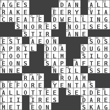 ACROSS 1. Grows older 5. Daniel's nick name 8. Everything 11. Libertine 12. Suggestive of the supernatural 13. By way of 14. Cause to be 17. Home 19. Sounds asleep 21. Annoying sounds 22. Commotion 23. One (Scot) 24. Eastern Standard Time (abbr.) 27. Period of immesurable duration 29. Mayday 32. Showery time 34. ___ good deed 36. Ending for "Through" and "Enough" 37. A blast of a horn 38. Shade tree 39. Grain storage tower 40. Immeasurably long periods of time 41. Plant excrement 42. Following 43. Compass dir. 44. Famous astronaut Armstrong 46. Compass dir. 47. Hit sharply and swiftly 50. Wander 52. Prior to 55. Gossips 57. One to whom something is allotted 59. Beer mug 62. Cards in a Roman deck? 63. Angers 64. Have the gumption 65. Was introduced to 66. Age 67. Heroin DOWN 1. Curve 2. Slender fish 3. Supplements with great effort 4. Actors Connery and Penn 5. Morning condensation 6. Sports stadium 7. High-strength synthetic material 8. Opinion 9. Actor's bit 10. Falls behind 12. Begley and Asner 15. Add up to 16. One of the Great Lakes 18. Falsehood 20. Eats (away) 24. Ingested 25. Soup utensil 26. Heavy duty weighing machine 28. Pitcher Ryan 29. Costumes for special activities 30. Stares at amorously 31. Dinah or Pauly 33. It is 35. Electrical Unit 36. Order of Saint Francis (abbr.) 42. Having winglike extensions 45. Charged particles 47. Friend of Pooh 48. Nick name for Arthur 49. Stone: prefix 51. Unmarried girls 52. Lip ointment 53. Writer Wiesel 54. Sudden quick movement 55. Consenting reply 56. Neighbor of Neb. 58. Car or cant ending 60. Period 61. Part of a journey