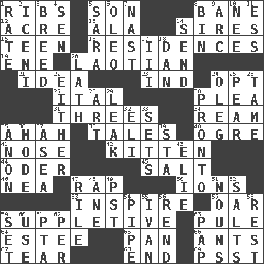 ACROSS 1. Chest bones 5. Male child 8. Object of repulsion 12. 43,560 square feet 13. Insect wing 14. Titles for men of rank and authority 15. Adolescent 16. Dwellings 19. Compass dir. 20. Of or relating to Laos or its people 21. The main thing one is thinking about 23. Indiana (abbr.) 24. Choose 27. Slanted text style (abbr.) 30. Entreaty 31. Triplets 34. 480, 500 or 516 sheets of paper 35. Nursemaid 38. Lies 40. Legendary monster 41. Characteristic smell of wine 42. Baby cat 44. River in Europe 45. Table seasoning 46. Teachers' org. 47. Hit sharply and swiftly 50. Charged particles 53. Stimulate to action 57. Boat paddle 59. Supplying deficiencies 63. Whine 64. First name in cosmetics 65. Baking dish 66. Pismires 67. Lacerate 68. Conclusion 69. Inconspicuous attention getter DOWN 1. Assign a rank or rating to 2. Ancient Celtic tribe of eastern Britain 3. A special lineage 4. Elected rep. 5. "Two Mules for Sister ____" 6. Margarine 7. Political cartoonist Thomas 8. Storage container 9. Curve 10. Born 11. Double-curved letter 14. Transmit 17. One more than two 18. Daniel's nick name 20. Thin strip of wood or metal 22. One or the other of two 24. Cassini of fashion 25. Lightbulb-shaped fruit 26. Docile 28. Nonscientific branch of learning 29. Path through which fluid escapes 30. Right away 32. Biblical high priest 33. Arranges properly for use 35. At once, immediately (arch.) 36. Method 37. Toward the sea 39. R.R. building 43. Writer Wiesel 47. Cause heat under the collar 48. A saturated hydrocarbon 49. Pacific Standard Time (abbr.) 51. Parts of speech 52. Table seasonings 54. Corncob 55. "Terrible" tsar 56. Tear apart 58. Respite 59. Put into a specified state 60. Purpose 61. Parent Teacher Association (abbr.) 62. For each 63. Infant food