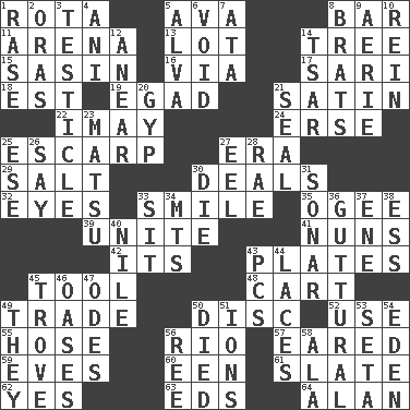 ACROSS 1. Round or rotation of duties 5. Actress Gardner 8. Soap unit 11. Sports stadium 13. Car dealer's back yard 14. Family _ (genealogy) 15. Indian antelope 16. By way of 17. Indian skirt 18. Eastern Standard Time (abbr.) 19. Mild oath 21. Smooth fabric 22. "If ____ say so..." 24. Celtic language 25. Fortification 27. Period 29. Table seasoning 30. Allots cards 32. Snake ____ (dice throw) 33. Grin 35. Double curve, resembling the letter S 39. Join together 41. Religious women 42. It is 43. Food holders 45. Implement 48. Heavy open wagon 49. Swap 50. Flat circle 52. Purpose 55. Flexible conduit 56. River (Sp.) 57. Having ears or earlike features 59. Nights before holidays 60. Car or cant ending 61. Chalkboard 62. It is so 63. Begley and Asner 64. Actor Alda or Thicke DOWN 1. To erase 2. Mouths or openings 3. One of the two male reproductive glands 4. Black tropical American cuckoo 5. Inventor's middle name 6. Nothingness 7. "One Day ___ Time" 8. Naughty children 9. Nest on high 10. It's straight from the horse's mouth 12. Approach 14. Russian ruler of old 20. Flimflam 21. Lick closed 23. Taiwanese island in East China Sea 25. Compass dir. 26. Declare 27. Snakelike fish 28. Actress Charlotte 30. Pass on 31. Echolocation 33. Be seated 34. Mountains (abbr.) 36. From the throat 37. Compass dir. 38. Curvy letter 40. The longest river in the world 43. Personal Computers (abbr.) 44. Shoestrings 45. Collection of objects 46. Fertile tracts in a desert 47. Lyric poems 49. Those people 50. Passed on 51. Charged particles 53. Stalk of a moss capsule 54. Paradise 56. To separate or throw off 58. In the manner of