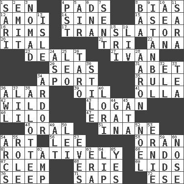 ACROSS 1. Elected rep. 4. Groovy apts. 8. Prejudice 12. Mine, in Marseilles 14. Trig term 15. Toward the sea 16. Basketball hoops 17. Interpreter 20. Slanted text style (abbr.) 21. Three (prefix) 22. Santa ___, CA 23. Started a card game 27. "Terrible" tsar 29. Oceans 31. Collude with 34. To the left, to Queeg 35. Governing power 36. Having or resembling wings 39. Lubricate 41. Rounded earthenware pot or jar 42. Uncontrolled 43. Utah city north of Ogden 46. _ and Stitch 47. Part of Q.E.F. 48. Relating to the mouth 51. Empty; void 54. Nonscientific branch of learning 56. Area sheltered from the wind 58. Northwest Algerian city 61. Producing rotation 66. Inside; within (prefix) 67. Clement's nick name 68. 4th largest of the Great Lakes 69. Hats (slang) 70. Ooze 71. Plant excrements 72. Compass dir. DOWN 1. Indian skirt 2. Send forth 3. Roamer 4. Pacific Standard Time (abbr.) 5. Atmosphere 6. Heredity factor (abbr.) 7. Transmitted 8. Sound made by sheep 9. Byzantium, centuries later 10. Age 11. "Two Mules for Sister ____" 13. Small island 18. Indian title of respect (Mr.) 19. 54 in ancient Rome 24. Cleo's killer 25. Lion 26. Edible starchy tuberous root 28. Composer Copland 30. Vertical member of a panel or frame 32. Pipe bend 33. Beverage made from leaves 34. Zeal 36. Leather borer 37. Cards in a Roman deck? 38. One to whom something is allotted 40. Australian parrot (variant) 44. Separate the seeds from cotton 45. _ moment's notice (2 wds.) 49. Keyboard modifier key 50. Flowery wreath 52. Christmas carol 53. Bert's buddy 54. Curves 55. Hero or heavy, e.g. 57. Nights before holidays 59. Sums up 60. Olfactory organ 62. Electrical Unit 63. Period 64. Mouth edge 65. Affirmative reply