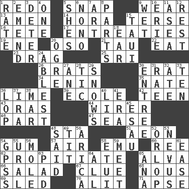 ACROSS 1. Redecorate 5. Fastener 9. Erode 13. So be it 14. Israeli folk dance 15. Laconic 16. False hair 17. Pleas 19. Compass dir. 20. Bear (Spanish) 21. The 19th letter of the Greek alphabet 22. Consume 23. To draw with force 25. Indian title of respect (Mr.) 26. Naughty children 30. Part of Q.E.F. 34. Soviet premier 1918-24 35. Nathan's nickname 36. Welles in "The Third Man" 39. Learning spot: Fr. 42. Adolescent 43. Mouths or openings 44. One who wires 46. Component 47. Gospel singer Marvin 48. R.R. building 51. A really long time 54. Chewing product 57. Atmosphere 58. Australian flightless bird 60. To sift 62. Appease 65. Inventor's middle name 66. Vegetable dish 67. A slight indication 68. Horse sense 69. Downhill vehicle 70. Set down 71. Domed church section DOWN 1. Assign a rank or rating to 2. Make improvements or corrections to 3. Prevent from occurring 4. Single 5. "______ My Girl" (Turtles hit) 6. Words to Nanette 7. Tate display 8. Pieces 9. Soggy 10. One of the Great Lakes 11. At sea 12. Respite 15. "Change" in Tahitian 18. Hearing organ 20. Legendary monster 24. Most capable 27. A saturated hydrocarbon 28. Nervous spasm 29. Overwhelms 30. Main course 31. Actress Charlotte 32. Had dinner 33. Nine, plus one 36. Trim (branches) 37. Lyricist Gershwin 38. Spoil 40. Falsehood 41. Epoch 45. Son of Isaac 48. Expressed in words 49. Teat (slang) 50. N. Chile seaport 52. Lowest deck of a ship 53. Congenital growth or mark on the skin 54. Global Positioning Systems (abbr.) 55. Mountain range 56. Undercover agent 58. Needle case 59. Rendezvous 61. Comfort 63. Groovy apt. 64. Everything 65. Santa ___, CA