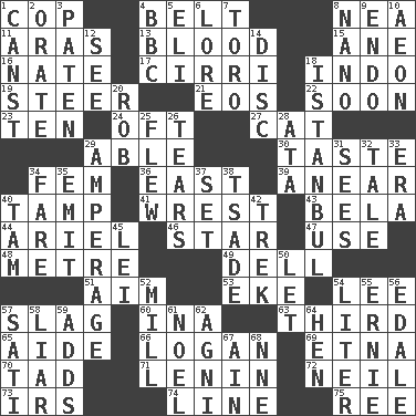 ACROSS 1. Police officer (slang) 4. Waist strap 8. Teachers' org. 11. Ancient river in northeast Turkey 13. Vital fluid 15. One (Scot) 16. Nathan's nickname 17. High-altitude cloud 18. Southeast Asian peninsula 19. Guide 21. Greek goddess of the dawn 22. Within a short period 23. Nine, plus one 24. Often (poetically) 27. Domesticated feline 29. Competent 30. Clothes sense 34. Opposite of masc. 36. Compass direction 39. Approach 40. Pack (down) 41. Take or capture by force 43. Actor Lugosi 44. Satellite of Uranus 46. Play the lead 47. Purpose 48. Distance measurement (Brit.) 49. Small valley 51. Direct toward a target or goal 53. Supplement with great effort 54. Area sheltered from the wind 57. Volcanic refuse 60. _ tizzy (2 wds.) 63. One of three equal parts 65. Helper 66. Utah city north of Ogden 69. Inactive volcano in Sicily 70. Small boy 71. Soviet premier 1918-24 72. Famous astronaut Armstrong 73. Big collection agency 74. Actor's bit 75. To riddle DOWN 1. 2nd pers. sing. pres. of can (arch.) 2. Speak pompously 3. Eucharist need 4. English channel? 5. Biblical high priest 6. Old wives' tales, e.g. 7. "Corrida" creature 8. Billionth: prefix 9. Inside; within (prefix) 10. Period of immesurable duration 12. Observe 14. Plate 18. Byzantium, centuries later 20. Director Reiner 25. Soared 26. Pulls into pieces 28. _ moment's notice (2 wds.) 29. Electrical Measurement 31. Observes 32. Story 33. Period 34. Conductor's collection 35. Send forth 37. Put into a specified state 38. Sadhe (variant) 40. Scottish cap 42. Long journey 45. Flowery wreath 50. Allow 52. Place where flour is made 54. 61 cubic inches 55. Bert's buddy 56. Peak District village in England 57. Suttee (variant) 58. One who doesn't tell the truth 59. Does sums 61. Christmas carol 62. Hindu god of fire 64. Layer 67. The 18th letter of the Arabic alphabet 68. Compass dir.