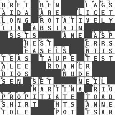 ACROSS 1. Cy Young winner Saberhagen 5. Benjamin's nick name 8. Falls behind 12. Opera by Verdi 13. "We ___ not amused" (Victoria) 14. It is permitted: Lat. 15. Yearn 16. Happening in regular succession 19. Call ___ day 20. Refrain by choice 21. Fast planes 23. One (Scot) 24. Viper 27. Command 30. Blunders 31. Artist's stands 34. Nuclear Threat Initiatives 35. Afternoon social gatherings 38. Grayish beige 40. Trial 41. Toward shelter 42. Nomad 44. "Vaya con ____" 45. Naked 46. Elected rep. 47. Arrange properly for use 50. Famous astronaut Armstrong 53. Chrissie's court nemesis 57. River (Sp.) 59. Appease 63. Frog relative 64. Upper-body garment 65. Mountains (abbr.) 66. Singer Murray 67. Lacquered or enameled metalware 68. Cooking vessel 69. Russian ruler of old DOWN 1. Indonesian resort city 2. Disturbances 3. Ferber et al. 4. Label 5. Sharp remark 6. Greek god of love 7. Remaining after all deductions 8. 54 in ancient Rome 9. Adept person 10. Set 11. Filthy place 14. Actor's bit 17. American Automobile Association (abbr.) 18. Shallow baking pan 20. At sea 22. College papers 24. Johnson of "Laugh-In" 25. Indian titles of respect 26. Inconspicuous attention getter 28. Fast jet (abbr.) 29. Rend 30. Main course 32. Nilotic language 33. Connect, as a bridge 35. Small amounts or degrees 36. Writer Wiesel 37. Age 39. Australian flightless bird 43. Pulitzer Prize-winning author Ferber 47. Stricken, poetically 48. Ingest 49. Three (prefix) 51. Metal shackles 52. Woody, climbing, usually tropical plant 54. Pack (down) 55. "Tell ____ the Marines!" 56. A home for chicks 58. River in Europe 59. Pacific Standard Time (abbr.) 60. 17th letter of the Greek alphabet 61. Petroleum 62. Before (prefix) 63. Make lace