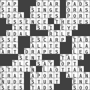 ACROSS 1. Infant food 4. Letter starter 8. Groovy apts. 12. Title for a knight 13. Scorch 14. Mouths or openings 15. The content of cognition 17. _____ Park, CO 18. Left side of a ship or aircraft 19. Core 21. College papers 23. Eisenhower's nickname 24. _ Lanka 26. Sight organ 27. Freehold land 28. Cause heat under the collar 30. Compass dir. 31. Fortification 34. Keyboard key 37. Car or cant ending 38. Having winglike extensions 39. Insect wing 40. Nonscientific branch of learning 41. Window treatments 42. Part of a journey 43. Posted 44. Story 46. Affectionate concern, for short 47. Declare 50. Elect 51. Put through a sieve 54. Of or relating to Laos or its people 57. Part of Q.E.F. 58. To the left, to Queeg 60. ____ Jay Lerner 62. Naked 63. Check the growth or development of 64. Compass dir. 65. Perceives with the eye 66. Small boys 67. "Barney Miller" actor Jack DOWN 1. Air pressure measure (abbr.) 2. Assistant 3. Elected leader of a country 4. Flat circles 5. Keyboard key 6. Ripen 7. State of inaction 8. Wimpy's pal 9. Came up 10. Have the gumption 11. Fast planes 13. Elected rep. 16. "____ silly question..." 20. Snakelike fish 22. Assist 25. Feeling or showing extreme anger 27. One who uses or employs something 29. Angers 30. Ocean 31. Merit 32. Narrow boards 33. Head covering 34. Baron Munchausen's specialties 35. Toward shelter 36. Container for groceries 41. Tenth: prefix 43. Chalkboards 44. Small child 45. Capital of Western Samoa 46. Exchange 48. Verbally 49. Entertaining tales 51. Elected reps. 52. Loyal 53. Political cartoonist Thomas 55. Baseball player Mel 56. Billionth: prefix 59. Parent Teacher Association (abbr.) 61. Modern: prefix
