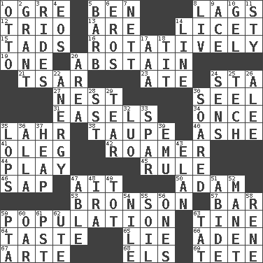 ACROSS 1. Legendary monster 5. Benjamin's nick name 8. Falls behind 12. Musical group of three 13. "We ___ not amused" (Victoria) 14. It is permitted: Lat. 15. Bits 16. Happening in regular succession 19. Single 20. Choose not to consume 21. Russian ruler of old 23. Had dinner 24. R.R. building 27. A home for chicks 30. Stitch closed the eyes of (a falcon) 31. Artist's stands 34. At one time in the past 35. Cowardly lion portrayer 38. Grayish beige 40. American tennis player Robert 41. Cassini of fashion 42. Wanderer 44. Shaw product 45. Governing power 46. Plant excrement 47. Small island 50. First man 53. "Death Wish" actor 57. Soap unit 59. Census information 63. Prong on a fork 64. Clothes sense 65. Falsehood 66. An important port of Yemen 67. Johnson of "Laugh-In" 68. Raised railways 69. Wig DOWN 1. "Beetle Bailey" pooch 2. Monetary aid 3. Amusement-park features 4. Greek goddess of the dawn 5. Sharp remark 6. Greek god of love 7. Remaining after all deductions 8. 54 in ancient Rome 9. Adept person 10. Set 11. Filthy place 14. Actor's bit 17. Auto club (abbr.) 18. Teat (slang) 20. Length times width 22. Disorder of the immune system 24. Elected reps. 25. Technical work 26. Toward shelter 28. Fast jet (abbr.) 29. Lacerate 30. Flew 32. Nilotic language 33. Practice fight 35. Chops off 36. Silent film actress Nazimova 37. Pile 39. Australian flightless bird 43. Liveliness 47. Competent 48. Retirement account (abbr.) 49. Small child 51. Stay 52. French painter Edouard 54. Mediterranean tributary 55. Land 56. Washington bills 58. French philosopher Descartes 59. Parent Teacher Association (abbr.) 60. Boat paddle 61. Pacific Standard Time (abbr.) 62. Shoshoni 63. Make lace