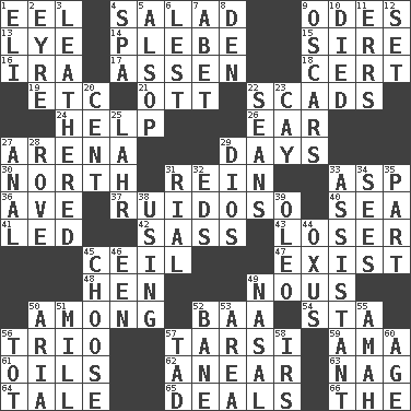 ACROSS 1. Snakelike fish 4. First course 9. Lyric poems 13. Sodium hydroxide 14. Cadet 15. Male parent of an animal 16. Lyricist Gershwin 17. NE Netherlands city 18. Sure thing 19. And so on (abbr.) 21. Baseball player Mel 22. Large numbers or amounts 24. Assist 26. Ewer handle 27. Sports stadium 29. 24-hour periods 30. Compass direction 31. It's straight from the horse's mouth 33. Cleo's killer 36. "___ Maria" 37. Boisterous (Brazilian Portuguese) 40. Ocean 41. Directed 42. Backtalk 43. Failure 45. To provide with a ceiling 47. Have an existence 48. Layer 49. Horse sense 50. Amid 52. Sound made by sheep 54. R.R. building 56. Musical group of three 57. Tarsus (plural) 59. Housemaid (var.) 61. Petroleums 62. Approach 63. Tired old horse 64. Falsehood 65. Allots cards 66. Definite Article DOWN 1. Biblical high priest 2. Jane of fiction 3. Tough but pliablecoriaceous 4. Health resort 5. Columnist Joseph or Stewart 6. For fear that 7. Collude with 8. Lair 9. Motion picture awards 10. Passed on 11. Blunders 12. Put into a specified state 20. Penny 22. Actors Connery and Penn 23. Island 25. Cowardly lion portrayer 27. Of or related to the anus 28. Be footloose 29. "Vaya con ____" 31. Monetary unit of Yemen 32. Begley and Asner 33. Aide 34. Perceives with the eye 35. Component 38. Exploiting 39. Margarine 44. The longest river in Central Asia 45. Elect 46. Car or cant ending 49. Rhinal 50. Operatic vocal solo 51. Place where flour is made 52. Object of repulsion 53. Length times width 55. Nanny 56. Small child 57. Small boy 58. Big collection agency 60. Mature