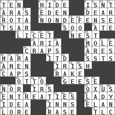 ACROSS 1. Nine, plus one 4. Flintstone garb 8. Is not 12. Caspian sea tributary 14. Paradise 15. Letter starter 16. Roll call or roster of names 17. Unrelated to defense, as in spending 20. Russian ruler of old 21. "Barney Miller" actor Jack 22. Had dinner 23. It is permitted: Lat. 27. Egg locale 29. Roberta Peters solo 31. Undercover agent 34. Dice game 35. Ancient Greek god of war 36. Hindu Mythology: god of death 39. It would 41. Fast planes 42. So be it 43. From or relating to Ireland 46. Smile enhancers 47. Libertine 48. "Beetle Bailey" pooch 51. Honkers 54. And not 56. Big collection agency 58. The longest river in Central Asia 61. Pleas 66. Kenny Rogers chart-topper in '80 67. It may be bright or harebrained 68. Taverns 69. Enthusiasm 70. Old wives' tales, e.g. 71. To erase 72. Affectionate concern, for short DOWN 1. Small pie 2. Greek god of love 3. Brizilian seaport 4. Layer 5. Wedding promise 6. Lair 7. Conclusions 8. Binary compound 9. Elected representatives 10. Political cartoonist Thomas 11. Relationship diagram 13. Indian skirt 18. Age 19. Enemy 24. Automobile 25. Epoch 26. Native american tent (variation) 28. Box-office sellout 30. Having gotten out of bed 32. Allow 33. Double-curved letter 34. 2nd pers. sing. pres. of can (arch.) 36. Apple computer (short form) 37. Wet nurse (var.) 38. Newsperson 40. To be drawn or hauled along 44. Mamie's husband 45. Perceive with the eye 49. Standoff 50. Mouth or opening 52. Flatfish 53. Glorify 54. Famous astronaut Armstrong 55. Southwest Nigerian state 57. Agitate 59. Freehold land 60. Synchronize (abbr.) 62. Actress Charlotte 63. _ tizzy (2 wds.) 64. Followers of ems 65. Compass dir.