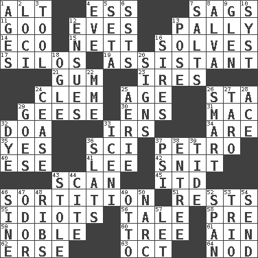 ACROSS 1. The first octave above the treble staff 4. Double-curved letter 7. Droops 11. Thick or sticky substance 12. Nights before holidays 13. Chummy 14. Environmental prefix 15. Remaining after all deductions 16. Finds the solution 17. Grain storage towers 19. Aide 21. Chewing product 23. Angers 24. Clement's nick name 25. Grow older 26. R.R. building 29. Honkers 30. Followers of ems 31. Apple computer (short form) 32. ___ good deed 33. Big collection agency 34. "We ___ not amused" (Victoria) 35. It is so 36. _-fi 37. Stone: prefix 40. Compass dir. 41. Area sheltered from the wind 42. In a ____ (agitated or irritated) 43. Examine hastily 45. It would 46. Casting lots 51. Musical pauses 55. Foolish or stupid persons 56. Falsehood 58. Before (prefix) 59. Impressive in appearance 60. Relationship diagram 61. The 18th letter of the Arabic alphabet 62. Celtic language 63. Sep. follower 64. Dreamland DOWN 1. Eras 2. Locales 3. Implement 4. First lady 5. Bristle 6. Fast planes 7. Table seasonings 8. Inventor's middle name 9. Small, secluded valley 10. System (abbr.) 12. Follows as a consequence or result 13. Introduce or present, as a question 16. Begets 18. Stare at amorously 20. Signals 22. Madame (abbr.) 24. Desist 25. Nest on high 26. Don Adams' spy role 27. Pacific island yam 28. Adept person 29. Moves 32. Color 33. Ancient Celtic tribe of eastern Britain 36. Narrow boards 37. Air pressure measure (abbr.) 38. Main course 39. Event that recurs at intervals 43. Took without asking 44. Quote 46. Trig term 47. Scent 48. Chest bones 49. Von Bismarck 50. Drug cop 52. Connect, as a bridge 53. Musical group of three 54. Transmit 57. Allow