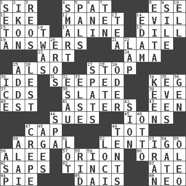 ACROSS 1. Title for a knight 4. Argument over a trivial matter 8. Compass dir. 11. Supplement with great effort 12. French painter Edouard 14. Morally bad or wrong 15. A blast of a horn 17. Place in a line 18. Deli pickle 19. Replies 21. Having winglike extensions 23. Tate display 24. Nursemaid (var.) 25. In addition 27. Discontinue 30. Binary compound 31. Oozed 34. Cask 37. Music discs 38. Schedule 39. Night before a holiday 40. Eastern Standard Time (abbr.) 41. Michaelmas daisies 43. Car or cant ending 44. Institutes legal proceedings 45. Charged atoms 47. Head covering 49. Small child 50. Therefore, facetiously 52. Small, flat, pigmented spot on the skin 56. Toward shelter 57. Greek mythologigal hunter 60. Relating to the mouth 61. Plant excrements 62. Colored lightly or faintly 63. Had dinner 64. Sliced dessert 65. Raised platform 66. Modern: prefix DOWN 1. Bristle 2. Picture 3. Vintage cars 4. Don Adams' spy role 5. Friends 6. Black tropical American cuckoo 7. Nine, plus one 8. Webber/Rice musical 9. Drop; flow; fall 10. Pipe bend 13. Beverage made from leaves 14. Dutch treat 16. It was, poetically 20. Greek god of love 22. Pet locale 25. Does sums 26. For fear that 27. Arguments over trivial matters 28. False hair 29. Baltic tributary 30. Frozen water 32. Son of Isaac 33. Otherwise 34. Peachy ____! 35. Nights before holidays 36. Commissioned mil. rank 42. The Jewish people; Israel 44. Health resort 46. "Beetle Bailey" pooch 47. Streamer paper 48. Eras 49. Portable shelters 50. Jai _ 51. Car dealer's back yard 52. Locales 53. SW Asia republic 54. Yard entry 55. Margarine 56. Cleo's killer 58. To free from 59. _ tizzy (2 wds.)