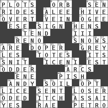 ACROSS 1. Graphs 6. Globe 9. Elected rep. 12. Amusement-park features 13. Toward shelter 14. Hub of activity 15. Unconcealed 16. Distinctive style or manner 17. Double curve, resembling the letter S 18. Compass dir. 19. Signal 20. Coop moms 21. Be inclined (to) 23. One more than two 24. Former U.S. Attorney General Janet 25. Overwhelms 28. "We ___ not amused" (Victoria) 30. Drug addict 34. Jennifer or Joel 35. French article 36. Lugs 38. It is 39. In a ____ (agitated or irritated) 41. Ancient Celtic tribe of eastern Britain 43. Eastern Standard Time (abbr.) 44. More peculiar 46. Curves 48. Compass dir. 49. Expression of disdain 50. Actor Griffith 51. Earth 53. Choose 56. Louse (plural) 57. Posted 58. Failure 60. Wrote a lyric poem 61. Hankering 62. Slender Brazilian palm 63. Consenting reply 64. Actress Charlotte 65. Stone: prefix DOWN 1. Adept person 2. Not recorded 3. Lyric poems 4. Cylindrical with tapered ends 5. Fast jet (abbr.) 6. Cassini of fashion 7. It's straight from the horse's mouth 8. Benjamin's nick name 9. Seigniories (variant) 10. Nights before holidays 11. Born 13. Enthusiastic 14. Cultivating 19. Snout, nose 20. Part of HMS, perhaps 22. Conclude 24. Homes 26. Moistens 27. System (abbr.) 28. In addition 29. Tear apart 31. Luau course 32. And so on (abbr.) 33. Portuguese money of account (variant) 37. Slow-paced one 40. Watched over 42. Big collection agency 45. Marina Del _, California 47. Elect 49. Essential or central part 50. Assistant 51. Bristle 52. Single time 54. Inconspicuous attention getter 55. Pull into pieces 56. Myrna of the movies 57. Title for a knight 58. Pet locale 59. _ de Janeiro