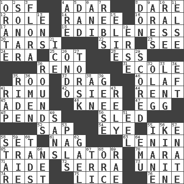 ACROSS 1. Order of Saint Francis (abbr.) 4. The sixth month of the Jewish calendar 8. Have the gumption 12. Hero or heavy, e.g. 14. The wife of a rajah (variant) 16. Relating to the mouth 17. At once, immediately (arch.) 18. The property of being fit to eat 20. Tarsus (plural) 22. Title for a knight 23. Perceive with the eye 24. Epoch 25. Small bed 28. Curvy letter 30. Western Nevada city 31. Learning spot: Fr. 35. Friend of Pooh 37. To be drawn or hauled along 40. Norwegian king 41. Tall New Zealand timber tree 42. Flexible twig of a willow tree 44. Monthly bill 45. Arabian gulf 46. Leg joint 47. Ovum 48. Depends 50. Downhill vehicle 52. Plant excrement 54. Sight organ 55. Mamie's mate 58. Arrange properly for use 61. Tired old horse 63. Soviet premier 1918-24 65. Interpreter 70. Hindu Mythology: god of death 71. Assistant 72. Father Junipero _ 73. A single undivided whole 74. Respite 75. Louse (plural) 76. Compass dir. DOWN 1. Speak pompously 2. Underwater navigation system 3. Plants 4. "We ___ not amused" (Victoria) 5. Male parent 6. Cuckoo 7. Confederate soldiers (slang) 8. Spanish title 9. Ancient Greek god of war 10. To erase 11. Otherwise 13. Followers of ems 15. Writer Wiesel 19. Celtic language 21. Frozen water 26. Southwest Nigerian state 27. Cod relative 29. Tallied 30. Periods in a boxing match 32. Cassini of fashion 33. Austrian-born American filmmaker Fritz 34. Newt 35. Travel on or in a vehicle 36. Sign of things to come 38. The 18th letter of the Arabic alphabet 39. Honkers 41. Strike 43. Have confidence or faith in 49. Without 51. Snakelike fish 53. Friends 55. Empty; void 56. Japanese brewing company 57. Maternal 58. Play the lead 59. 4th largest of the Great Lakes 60. Small boys 62. Highlander 64. Australian flightless bird 66. Fish or hair follower 67. Three (prefix) 68. The grampus (Milton) 69. Actress Charlotte