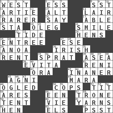 ACROSS 1. Compass direction 5. Double-curved letter 8. Fast jet (abbr.) 11. Nick name for Arthur 13. The first octave above the treble staff 14. Den 15. More valued for its uncommonness 16. Declare 17. Competent 18. R.R. building 19. Cassini of fashion 21. Grin 22. Periodic rise and fall of the sea level 24. Coop moms 25. Main course 27. Compass dir. 29. Small Philippine buffalo 30. From or relating to Ireland 32. Monthly bill 33. Small fatty European fish 35. At sea 39. Webber/Rice musical 41. Painter Guido (1575-1642) 42. Mouth or opening 43. More empty; more void 45. Hindu god of fire 48. Hindu Mythology: god of death 49. Stared at amorously 50. 911 reaches them 52. Teat (slang) 55. Ancient Greek god of war 56. Car or cant ending 57. Heavy duty weighing machine 59. Portable shelter 60. Compete 61. Tall tales 62. Layer 63. Raised railways 64. Inconspicuous attention getter DOWN 1. Armed conflicts 2. Part of Q.E.F. 3. Ski resort town in Vermont 4. Make a knot 5. Relaxation 6. Volcanic refuse 7. Filthy place 8. Unit of acoustic absorption 9. Beverly of Met fame 10. Woody plant 12. Eat (away) 14. Unable to walk 20. Area sheltered from the wind 21. "______ My Girl" (Turtles hit) 23. Feeling or showing extreme anger 25. Ewer handle 26. Compass dir. 27. Epoch 28. Be seated 30. Retirement account (abbr.) 31. Ethiopian city, capital of Harari 33. Title for a knight 34. Parent Teacher Assoc. 36. Legislators 37. Compass dir. 38. Atmosphere 40. Null 43. Naughty child 44. Difficult 45. Match 46. American astronaut and politician John 47. Egg locale 49. Pledge 50. To provide with a ceiling 51. Washington bills 53. Restaurants 54. Trial 56. First lady 58. Strike
