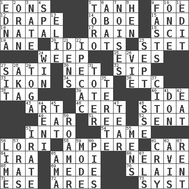 ACROSS 1. Immeasurably long periods of time 5. Hyperbolic tangent 9. Enemy 12. Window treatment 14. Mitch Miller's instrument 15. Plus 16. Relating to or accompanying birth 17. Water falling in drops from the sky 18. _-fi 19. A saturated hydrocarbon 20. Foolish or stupid persons 23. Proofreading order 24. Shed a tear 25. Nights before holidays 27. Suttee (variant) 30. Fish or hair follower 32. Small drink 33. Picture 34. Highlander 36. And so on (abbr.) 38. Label 39. Had dinner 40. Binary compound 43. Nonscientific branch of learning 46. Foregone conclusion 48. Portico 49. Hearing organ 51. To separate or throw off 52. Emitted 53. To the inside or interior of 54. Not wild 56. Australian parrot (variant) 58. Electrical Unit 61. Auto 64. Retirement account (abbr.) 65. Mine, in Marseilles 66. Boldness 68. Floor protector 69. Ancient Persian 70. Killed 71. Compass dir. 72. Ancient Greek god of war 73. System (abbr.) DOWN 1. Pulitzer Prize-winning author Ferber 2. NW Algerian seaport 3. Nathan's nickname 4. Health resort 5. "Corrida" creature 6. Blind as ____ 7. Annoying sounds 8. Layer 9. Goes without food and/or water 10. At one time in the past 11. Prepare for publication 13. Writer Wiesel 21. Hiding places for outlaws 22. Medicinal drug used to evoke vomiting 23. Back-to-school mo. 24. Acquire through effort 26. Compete 27. Be seated 28. Alias (abbr.) 29. Ancient Roman robe 31. Carrier 35. Cylindrical with tapered ends 37. Quote 41. Spanish title 42. Consume 44. Painter Guido (1575-1642) 45. Make lace 47. Pull into pieces 48. Compass dir. 50. Nomad 53. Feeling or showing extreme anger 55. Not women's 56. Welles in "The Third Man" 57. Mouths or openings 59. Method 60. Sliced desserts 61. Supercomputer manufacturer 62. Advice 63. Monthly bill 65. Nanny (var.) 67. Raised railways