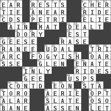 ACROSS 1. Hearing organ 4. Musical pauses 9. "Mermaids" star 13. Make a knot 14. Approach 15. Travel on or in a vehicle 16. Music discs 17. _ dish (used to culture cells) 18. Writer Wiesel 19. The 18th letter of the Arabic alphabet 21. Floor protector 22. Started a card game 24. Small, narrow, flatbottom fishing boat 26. Eastern Standard Time (abbr.) 27. Honkers 29. Raze (variant) 30. The wife of a rajah (variant) 31. Allodial 33. Three (prefix) 36. Curve 37. Out of fashion; old fashioned 40. Boat paddle 41. Compass dir. 42. Small, secluded valley 43. Related on the mother's side 45. In an inward manner 47. Amusement-park features 48. Unit of force equal to gravity 49. United States Postal Service (abbr.) 50. Continued (abbr.) 52. Period of immesurable duration 54. R.R. building 56. "Corrida" creature 57. Nest on high 59. Elect 61. Having or resembling wings 62. Chalkboard 63. Bear (Spanish) 64. Object of repulsion 65. NE Netherlands city 66. Allow DOWN 1. And so on (abbr.) 2. Opera by Verdi 3. Home 4. Hit sharply and swiftly 5. Foe 6. Stalk of a moss capsule 7. Small pie 8. _ Lanka 9. Make 10. Land elevation 11. Prepare for publication 12. To sift 20. Olfactory organ 22. Allots cards 23. Curvy letter 25. Coral ridge 27. Pate de foie ____ 28. Hearing organs 29. Precipitation 31. Unsightly 32. Color 33. Inedible or poisonous agaric 34. Pace 35. Angers 38. Stared 39. Possessive pronoun 44. Pinches, bites 45. Fail to notice 46. Fish or hair follower 49. Join together 50. Root beer relative 51. Northwest Algerian city 52. Snakelike fish 53. Mouths or openings 55. Domed church section 56. Keyboard key 57. White ___ sheet 58. Car or cant ending 60. Small child