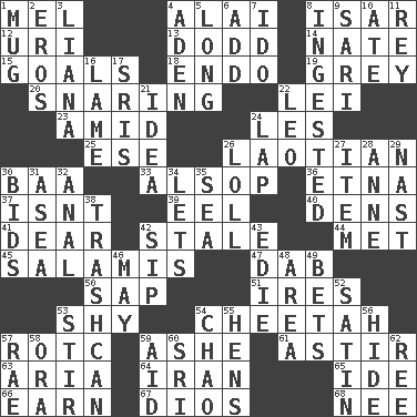 ACROSS 1. Cartoonist voice _ Blanc 4. Jai ____ 8. Austrian river, tributary to the Danube 12. RI univ. 13. Texas town _ City 14. Nathan's nickname 15. Finish lines 18. Inside; within (prefix) 19. Jennifer or Joel 20. Catching in a trap 22. Flowery wreath 23. Among 24. French article 25. Compass dir. 26. Of or relating to Laos or its people 30. Sound made by sheep 33. Columnist Joseph or Stewart 36. Inactive volcano in Sicily 37. Is not 39. Snakelike fish 40. Habitations of wild animals 41. Letter starter 42. Having lost freshness 44. Was introduced to 45. Deli grouping 47. Apply (a substance) by light strokes 50. Plant excrement 51. Angers 53. Like a shrinking violet 54. Leopard's kin 57. College mil. group 59. American tennis player Robert 61. Moving or stirring 63. Operatic vocal solo 64. SW Asia republic 65. Binary compound 66. Merit 67. "Vaya con ____" 68. Born DOWN 1. Large cup 2. Greek god of love 3. Climbing, woody, usually tropical vines 4. An important port of Yemen 5. Protracted 6. Say or write further 7. Wedding promise 8. Swallowed 9. Indian skirt 10. Had dinner 11. Marina Del _, California 16. Unable to walk 17. Indian titles of respect 21. The main thing one is thinking about 22. Lion 24. Pet locale 26. Hang loosely or laxly 27. A distinct part 28. Singer Murray 29. Political cartoonist Thomas 30. Auction offers 31. Toward the sea 32. Of or related to the anus 34. Allows 35. Ocean 38. File 13 42. Small drink 43. Singer Brickell 46. Can I? 48. Length times width 49. Antes 52. Smooth fabric 53. Use a spoon 54. US Secretary of Labor Elaine L. _ 55. Coop moms 56. Flintstone garb 57. Actress Charlotte 58. Mouth or opening 59. Assist 60. _ Lanka 62. Portuguese money of account (variant)