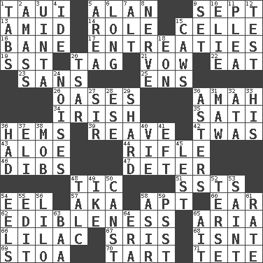 ACROSS 1. "Change" in Tahitian 5. ____ Jay Lerner 9. Back-to-school mo. 13. Among 14. Hero or heavy, e.g. 15. Cell (Danish) 16. Object of repulsion 17. Pleas 19. Fast jet (abbr.) 20. Label 21. Promise 22. Ingest 23. Without 25. Followers of ems 26. Fertile tracts in a desert 30. Nursemaid 34. From or relating to Ireland 35. Suttee (variant) 36. Folds over and sews together 39. Rob, plunder, or pillage 42. It was, poetically 43. Medicinal plant 44. Ransack; plunder; pillage 46. Claim 47. Prevent from occurring 48. Nervous spasm 51. Fast planes 54. Snakelike fish 57. Alias (abbr.) 58. Fitting 60. Ewer handle 62. The property of being fit to eat 65. Operatic vocal solo 66. Pale purple color 67. Indian titles of respect 68. Is not 69. Portico 70. Small pie 71. Wig DOWN 1. Bar bills 2. Collect or gather 3. National forest in Provo, Utah 4. Binary compound 5. Length times width 6. Protracted 7. Keyboard modifier key 8. Boldness 9. Put into a specified state 10. Writer Wiesel 11. Entreaty 12. Trial 15. Crow sounds 18. Age 20. Russian ruler of old 24. Annoying sounds 27. Title for a knight 28. Compass dir. 29. Broken piece 30. Michaelmas daisies 31. Informal term for the mouth 32. _ moment's notice (2 wds.) 33. Part of HMS, perhaps 36. Possessed 37. Biblical high priest 38. Crowd into 40. Compete 41. Newt 45. For fear that 48. Baby powder 49. Eisenhower's nickname 50. 2nd pers. sing. pres. of can (arch.) 52. Laconic 53. Virtuous person 54. Snakelike fish 55. Prepare for publication 56. _ and Stitch 58. SW Saudi Arabia district 59. Inconspicuous attention getter 61. Assign a rank or rating to 63. Sound made by sheep 64. Epoch 65. Small island