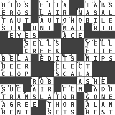 ACROSS 1. Auction offers 5. Singer James 9. Bar bills 13. Greek god of love 14. Den 15. Rhinal 16. Tense 17. Form of transportation 19. R.R. building 20. Corn or form start 21. Floor protector 22. To free from 23. Sight organs 25. Adept person 26. Makes a sale 30. Shout 34. Small stream 35. Writer Wiesel 36. Actor Lugosi 39. Proofreads 42. Cuts off 43. Fermented drink made from hops 44. Voters do this 46. Hoof sound 47. Any of the three canals of the cochlea 48. Director Reiner 51. American tennis player Robert 54. Institute legal proceedings 57. Atmosphere 58. Opposite of masc. 60. Find the sum of 62. Interpreter 65. Went 66. Match 67. Son of Odin 68. ____ Jay Lerner 69. Monthly bill 70. Arranges properly for use 71. Respite DOWN 1. Antes 2. Feeling or showing extreme anger 3. A city in N France, SE of Calais 4. Fast jet (abbr.) 5. Style 6. "Change" in Tahitian 7. Teat (slang) 8. Scent 9. Keyboard key 10. SW Saudi Arabia district 11. Indonesian resort city 12. Downhill vehicle 15. Brief written record 18. Big _ 20. One who makes use of a thing 24. Fortification 27. Area sheltered from the wind 28. Directed 29. Atmospheres 30. Gossips 31. Connecticut Ivy Leaguer 32. Mouth edge 33. French article 36. English channel? 37. Snakelike fish 38. Lion 40. Affectionate concern, for short 41. Ocean 45. Dollar (slang) 48. Raze (variant) 49. Lubricate 50. Naughty children 52. White Person, in Hawaii 53. Ferber et al. 54. Play the lead 55. Goad 56. Merit 58. Pick up the tab 59. Blunders 61. Gouge 63. Fish or hair follower 64. Definite Article 65. Slender fish
