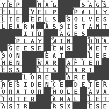 ACROSS 1. Slangy assent 4. Tired old horse 7. Droops 11. Pipe bend 12. Sharp bark 13. Friendly 14. Falsehood 15. Snakelike fish 16. Finds the solution 17. Acquire or gain knowledge or skills 19. Aide 21. It would 23. Matures 24. Frolic 25. Acquire through effort 26. Chief or king in Benin or Nigeria 29. Honkers 30. Followers of ems 31. Soggy 32. Male child 33. Ingest 34. Area sheltered from the wind 35. Layer 36. Armed conflict 37. Following 40. Double-curved letter 41. ___ a Wonderful Life 42. Small pie 43. Old wives' tales, e.g. 45. "We ___ not amused" (Victoria) 46. Home 51. Prevent from occurring 55. Speaker 56. Hollow 58. Actress Gardner 59. Carrier 60. Of or related to the anus 61. Allow 62. SW Saudi Arabia district 63. Acura sports coupe 64. Compass dir. DOWN 1. Shout 2. Writer Wiesel 3. Entreaty 4. Born 5. Silent film actress Nazimova 6. Global Positioning Systems (abbr.) 7. Table seasonings 8. Inventor's middle name 9. Small, secluded valley 10. System (abbr.) 12. Gossips 13. Introduce or present, as a question 16. Attaches a signature 18. Cause heat under the collar 20. Inhabitant of Heaven 22. Color 24. Actor Sean's family 25. Erodes 26. A small or young owl 27. Fermented drink made from hops 28. Had dinner 29. Travels 32. A female animal or person 33. Eroded 36. One who wires 37. "One Day ___ Time" 38. Burden 39. Relationship diagram 43. 61 cubic inches 44. Scent 46. Round or rotation of duties 47. Greek god of love 48. Suttee (variant) 49. Burn to charcoal 50. Immeasurably long periods of time 52. Falsehood 53. Nights before holidays 54. Assign a rank or rating to 57. Not strict
