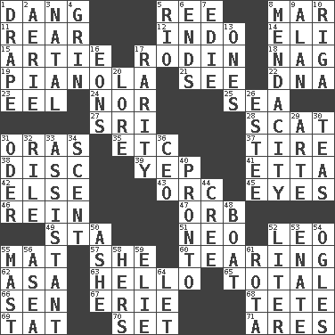 ACROSS 1. Mild oath, euphamism for damn 5. Portuguese money of account (variant) 8. Third mo. 11. Posterior 12. Southeast Asian peninsula 14. Connecticut Ivy Leaguer 15. Nick name for Arthur 17. "The Thinker" sculptor 18. Tired old horse 19. Player piano 21. Observe 22. Heredity factor (abbr.) 23. Snakelike fish 24. Not either 25. Ocean 27. _ Lanka 28. Go away! 31. Mouths or openings 35. And so on (abbr.) 37. Become fatigued 38. Plate 39. Slangy assent 41. Singer James 42. Otherwise 43. The grampus (Milton) 45. Sight organs 46. It's straight from the horse's mouth 47. Globe 49. R.R. building 51. Modern: prefix 52. Lion 55. Floor protector 57. A female animal or person 60. Pulling into pieces 62. White ___ sheet 63. Phone greeting 65. Add up to 66. Elected rep. 67. One of the Great Lakes 68. Wig 69. Make lace 70. Put into a specified state 71. Ancient Greek god of war DOWN 1. Window treatment 2. Nest on high 3. Relating to or accompanying birth 4. Broad smile 5. _ de Janeiro 6. Extremities 7. Singer Brickell 8. Ananias' fault 9. ____ Jay Lerner 10. Capital of Latvia 13. Singles 16. Immeasurably long periods of time 17. Noteworthy scarcity 20. Old wives' tales, e.g. 26. First name in cosmetics 29. Johnson of "Laugh-In" 30. Beverages made from leaves 31. Baltic tributary 32. Cause heat under the collar 33. Helper 34. Aroma 36. Corporate head (abbr.) 40. Right away 44. Algonquian 48. Water vessel 50. American tennis player Robert 52. 61 cubic inches 53. Maternal 54. Stares 55. Vertical spar for supporting sails 56. At sea 58. Possessive pronoun 59. Writer Wiesel 61. Round or rotation of duties 64. Allow